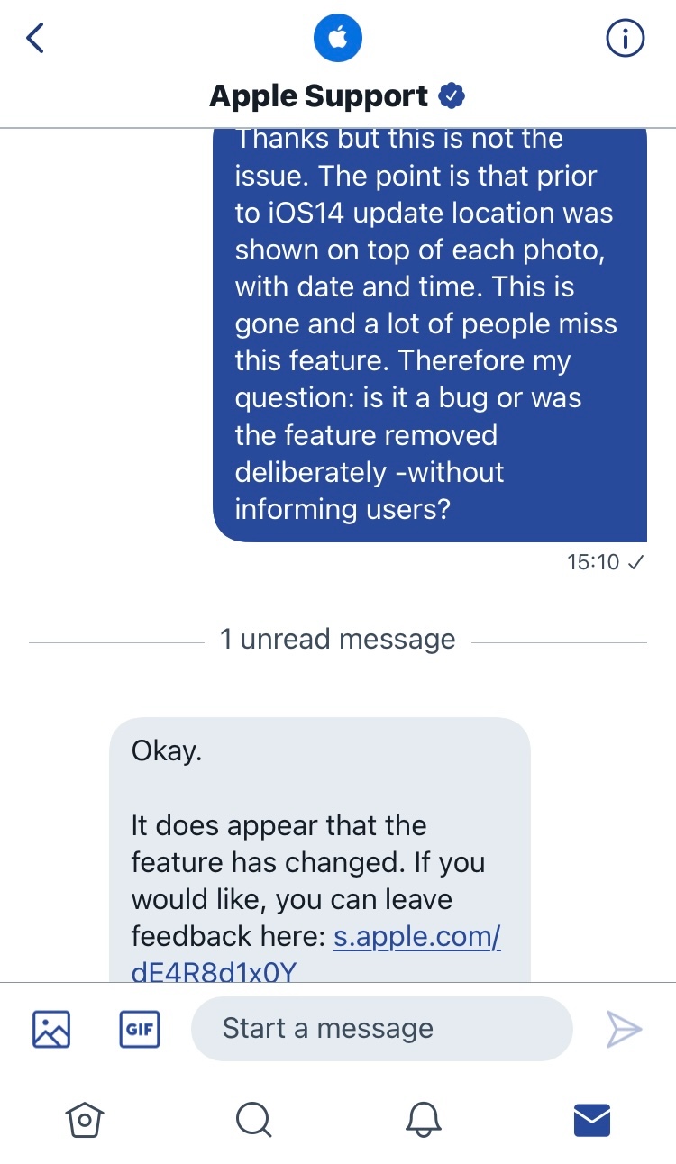 I've sent 5 DM's to @apple support on twitter, and 2 feedback forms via https://www.apple.com/feedback/photos-ios-ipados.html (phone was selected)...no replies....yet!