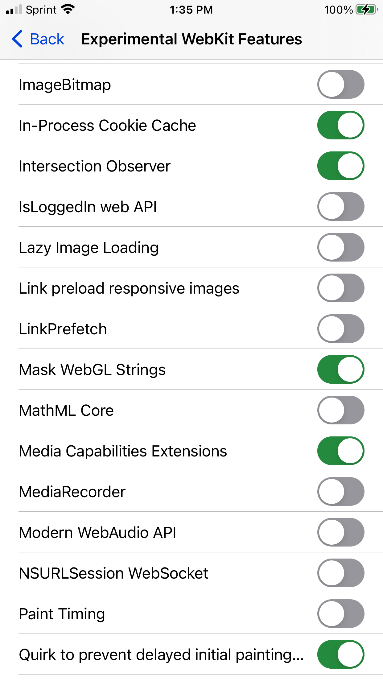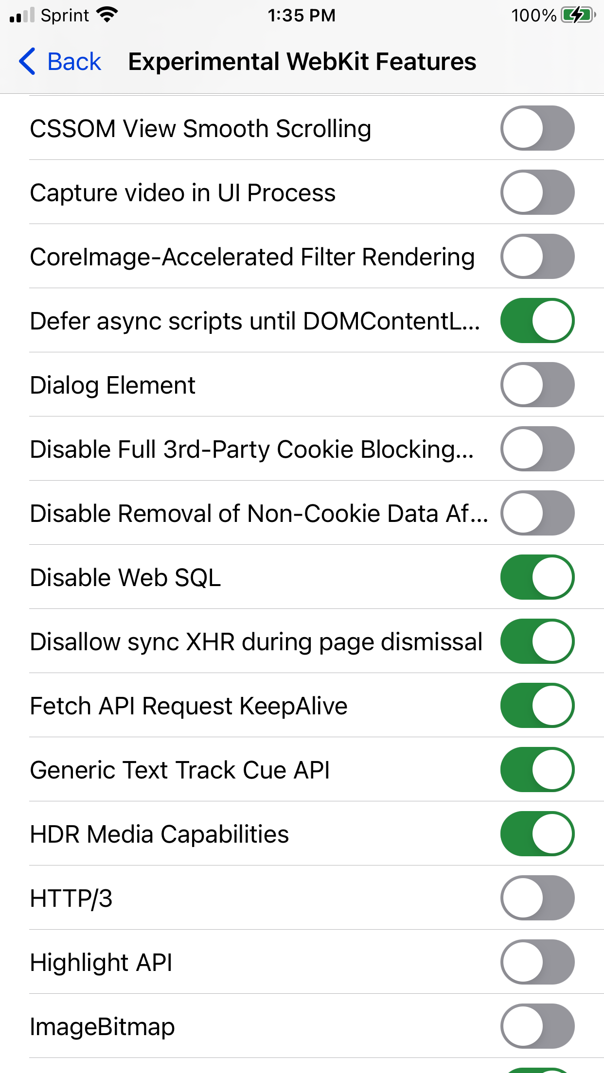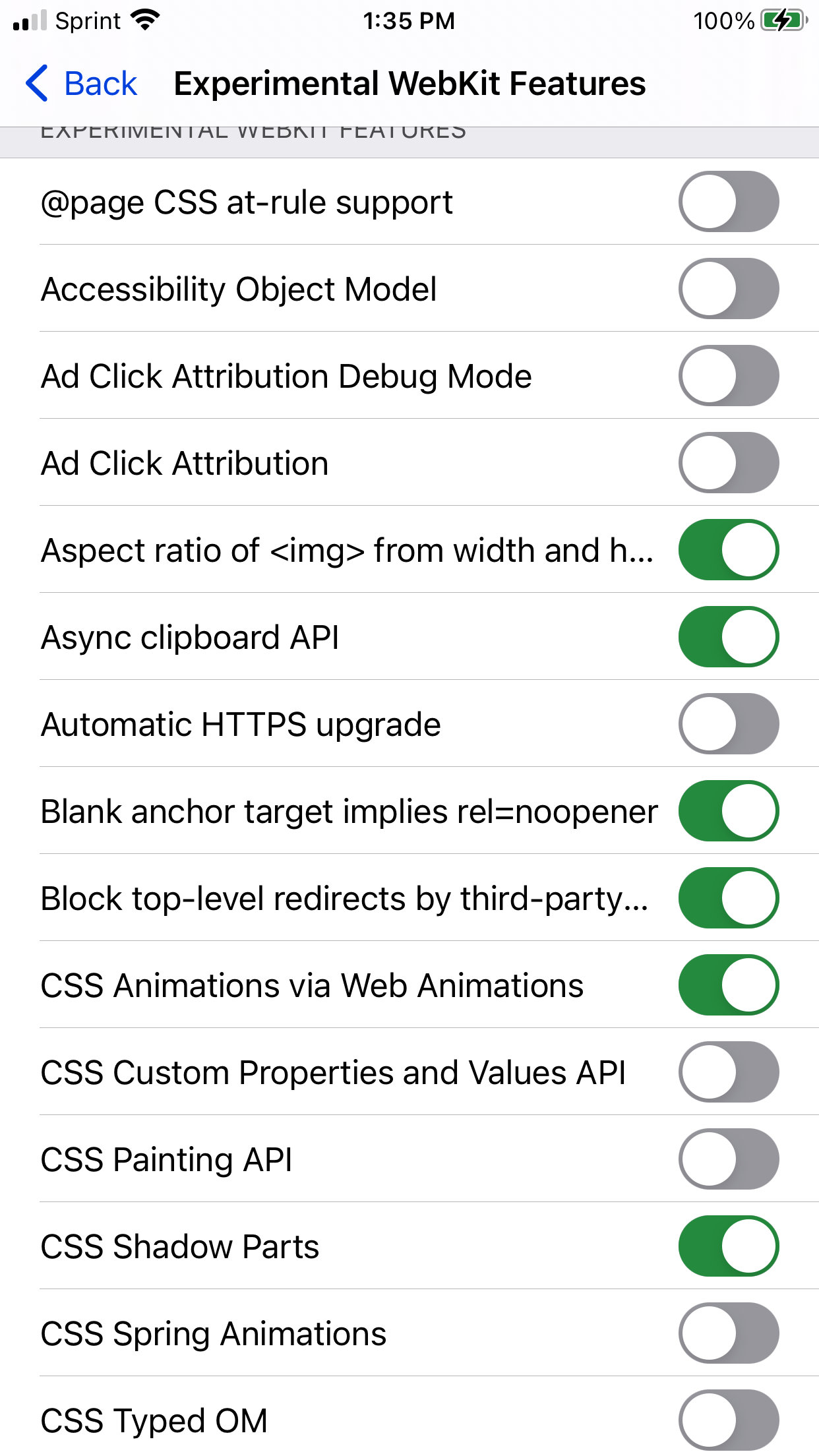 Dose anybody have or know the default settings to Experimental WebKit Features within Safari for IPhone 7Plus. I accidentally somehow toggled all of them off. A lot of my phone isn’t working properly..