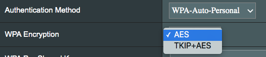 However if you set WPA then you can have both TKIP + AES meaning security is compromised when using that option. At least the Asus router allows you to force AES on WPA and not the usual combined TKIP + AES