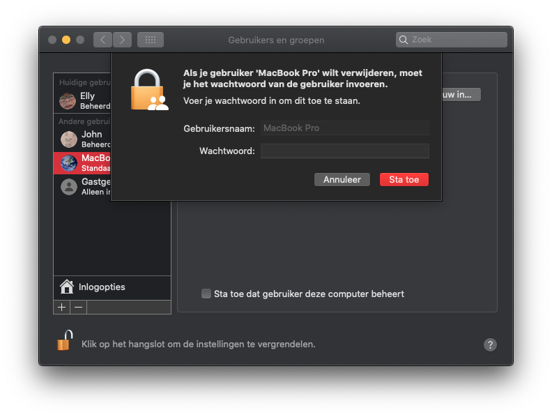 - See screendump. Translated: "If you want to remove user "MacBook Pro", you have to fill in the password of the user."
