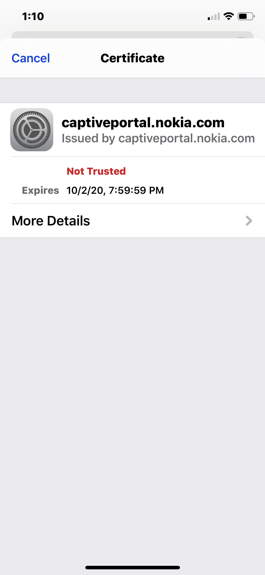 For the CaptivePortal error, I assume you are using a Nokia public website or a public website hosted by Nokia. Open Settings/Wi-Fi, find the network that you were trying to access when you got that message, tap on the i next to it and then “forget this network”. The next time you try to connect it should work. But public networks change their certificates frequently, so you can’t stay connected continuously for more than a few days without disconnecting and reconnecting.