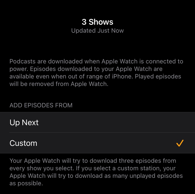 I’ve tried all the usual settings ensuring podcast syncing is on and trying both “Up Next” and “Custom” but they no longer sync when I put the devices on to charge. The watch just says No Episodes which is even more as the ones that were already there are seemingly deleted.