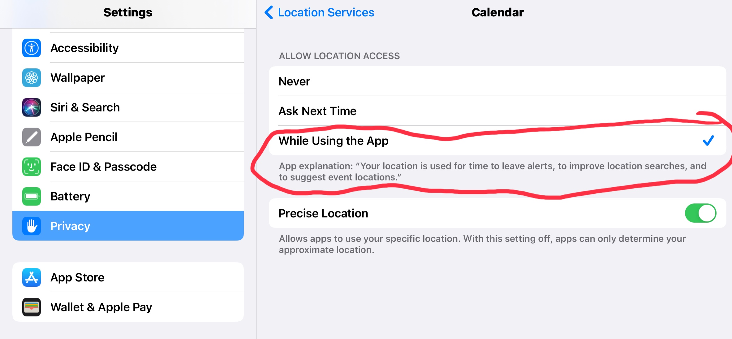 I also had this problem and tried Navymom’s solution but it didn’t work for me even though it was the correct answer. Then I realized that some folks need to go one step further because of other settings. So follow Navymom’s fix but if that doesn’t work for you, then also do this: While still in Location Services, click Calendar and turn on “Allow Location Access… While Using the App”. And turn on Precise Location.