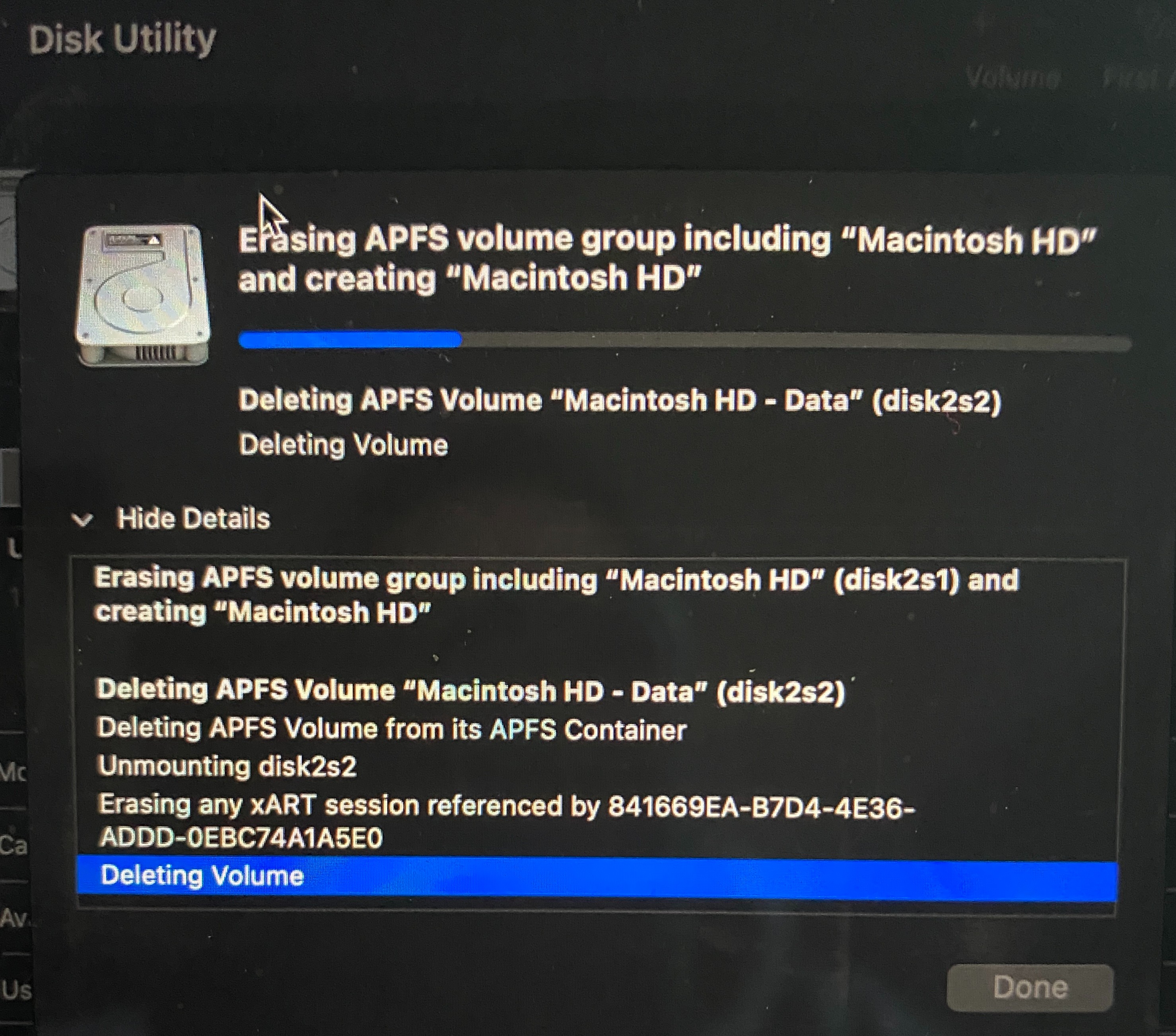 When I try to delete the entire volume using disk utility during MacOS recovery, it gets stuck on "Erasing APFS volume group" I left it for 7 hours and nothing happened. I was forced to turn it off and when backed on, normal log on screen as nothing happened. See the print screen below, the fan runs as crazy like the computer is taking off but, nothing.