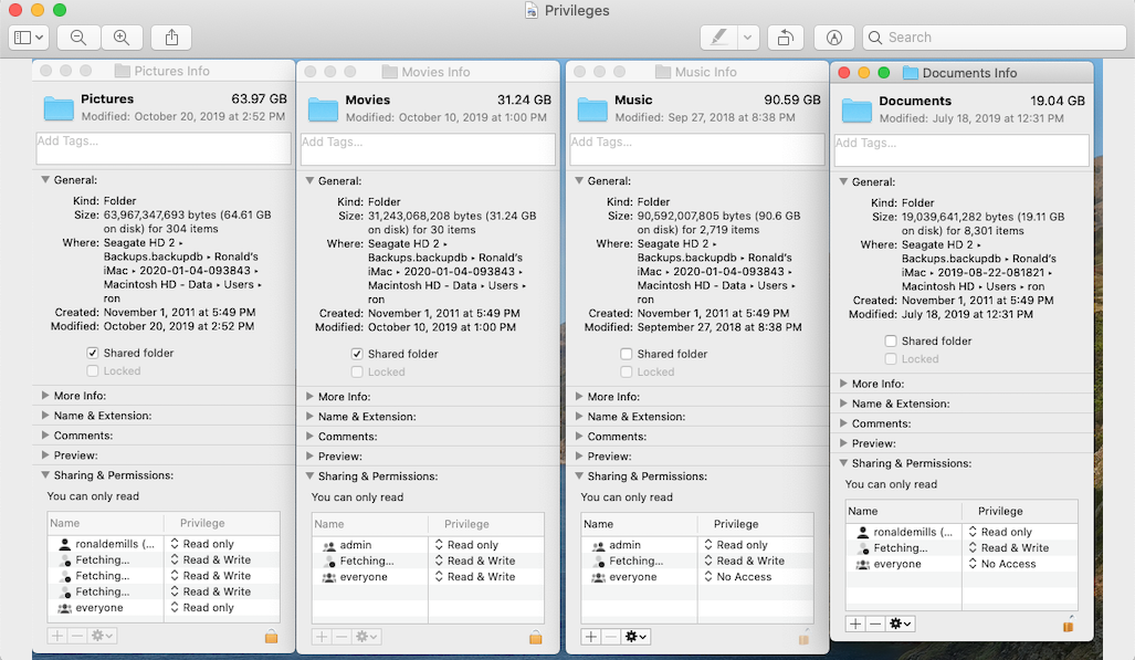 I've been forced to wipe and install the OS on my iMac after a trip to the genius bar. I had time machine in place thinking all my files would be available to me to restore. Now I can't find the files and when I find some, it claims I don't have privileges to access them. When I unlock and try to restore privileges, it only allows me "read Only" I need my documents (From the last 15 years) and all my music and photos for over 30 years. Someone please help me