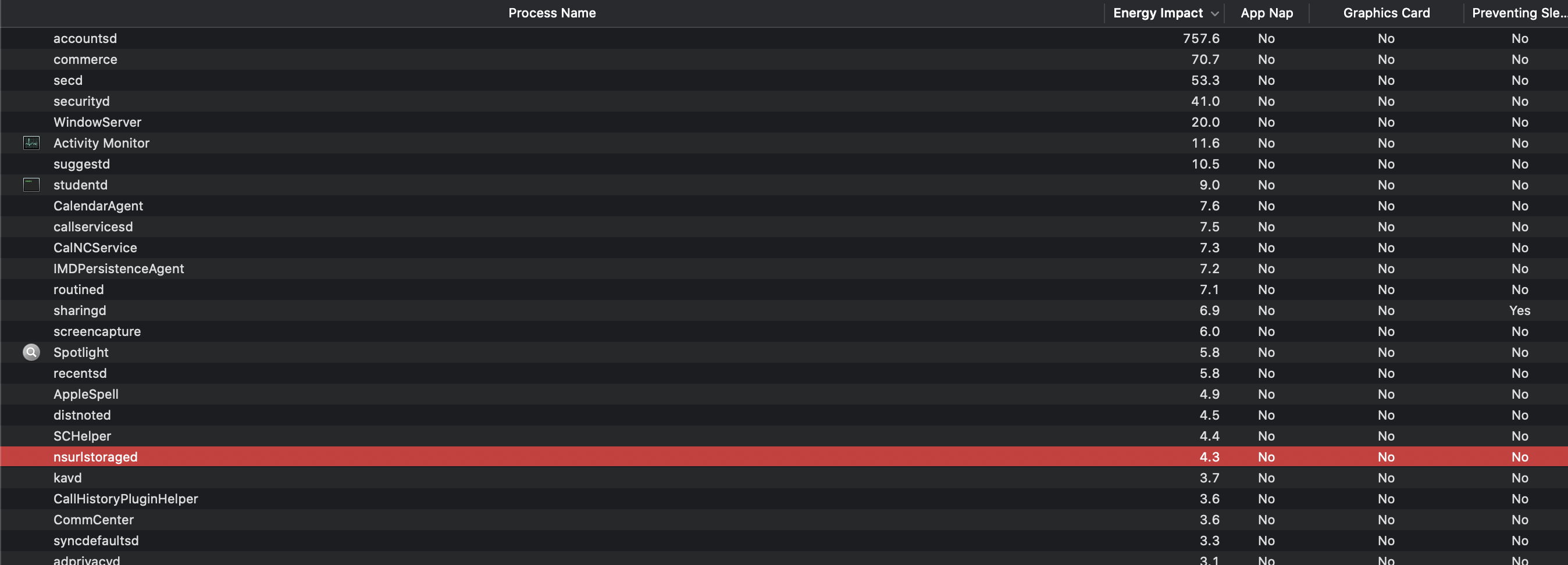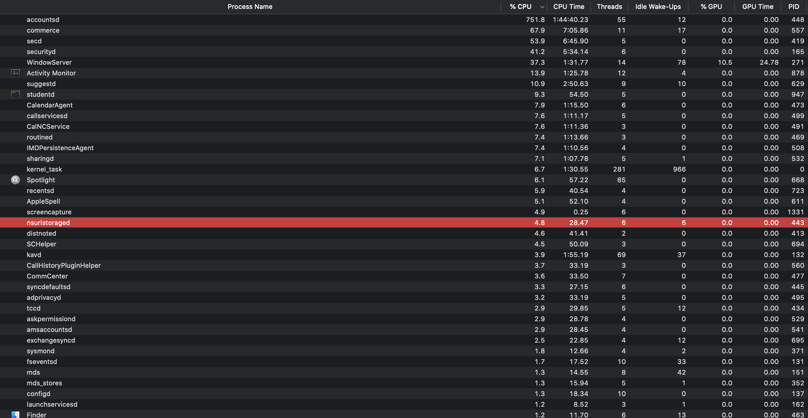 Since the new ios update 10.15.7 (19H2), my CPU and Ram memory is being hugely used by; Accountsd, and the disk from; nsurlstoraged. See attached.