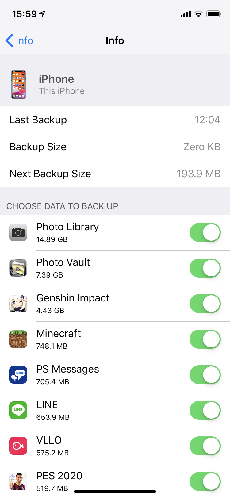 and here comes the last question. As you see it says “193 mb” for the next back up size when the apps listed below have like gbs. But the slider is turned to green. Plus. The back up size is 0 aswell even though my phone backups everyday. Does that mean literally nothing is backed up on my phone to iCloud? If so. How do I fix this? How can I back up all of my games into iCloud??(I have 50gb space on my iCloud so pretty sure space isn’t the problem here)