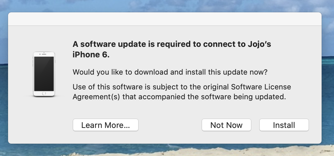 Thank you for asking Apple Support Communities about this! We see that an alert is appearing advising that an update is needed when you connect your iPhone. What happens if you choose "Install"? Does it show an update is available and start to install it? Let's also double check that your devices are fully updated. For your Mac, the current software version is 10.15.7. To find out what you have installed, select the Apple menu > About This Mac > Overview. For your iPhone, the current software version is 14.0.1. Tap Settings > General > About to see what you have installed on your iPhone. If updates are needed, be sure to back up first. Here are some guides to help, just in case: