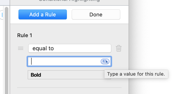 So, with Numbers 10.2 on a Mac (iMac?) you seem to be having some trouble with setting a Cell or Cells for Conditional Formatting.