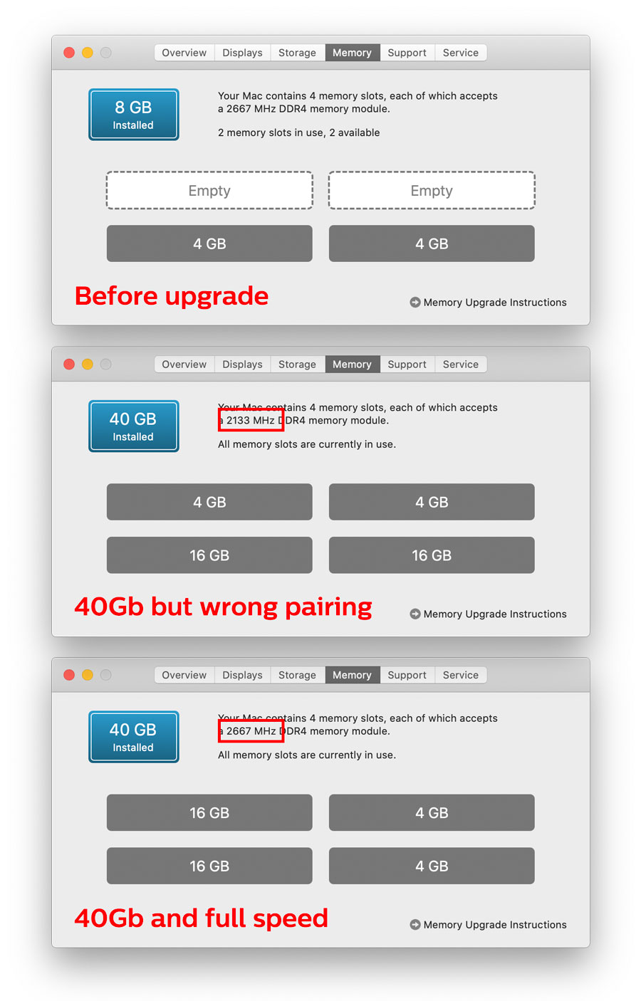 I bought OWC RAM, this is exactly what I bought. https://eshop.macsales.com/item/OWC/2666DDR4S32P/ and I already illustrated in an earlier post on this thread how they are installed and the speed results. If you live in an area (outside the USA) where OWC RAM is expensive, then please ONLY buy Crucial.com RAM. DO NOT BUY ANY OTHER BRANDS or from places like Amazon, NewEgg, etc...