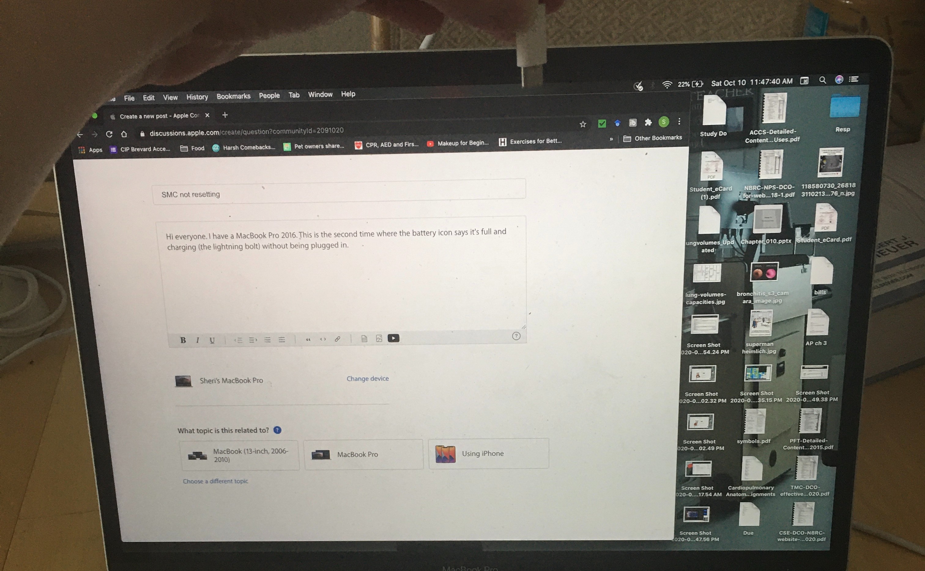 Hi everyone. I have a MacBook Pro 2016. This is the second time where the battery icon says it's full now and charging (the lightning bolt) without being plugged in, and some of the charging ports don't work. As of now, the battery icon loses the fullness icon, and just has the lightning bolt. The last time I got support, I was walked through resetting the NVRAM, PRAM, and SMC. Eventually, resetting the SMC worked. However, despite multiple attempts, none of these have worked. Please help! I rely on this computer to get me through school.