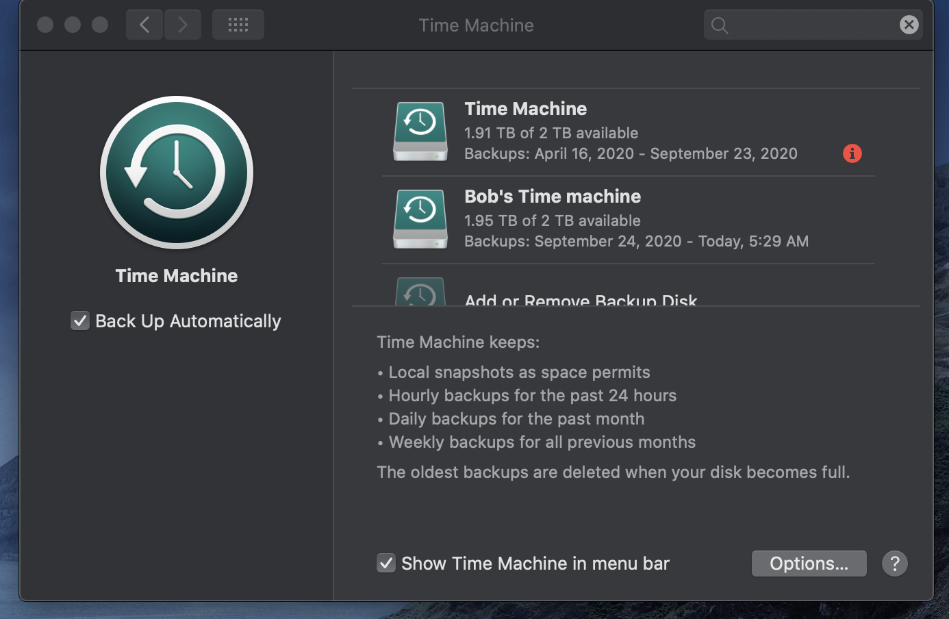 There's an add or remove Backup Disk right below those 2, I can't remember if one of the two need to be highlighted or not.
