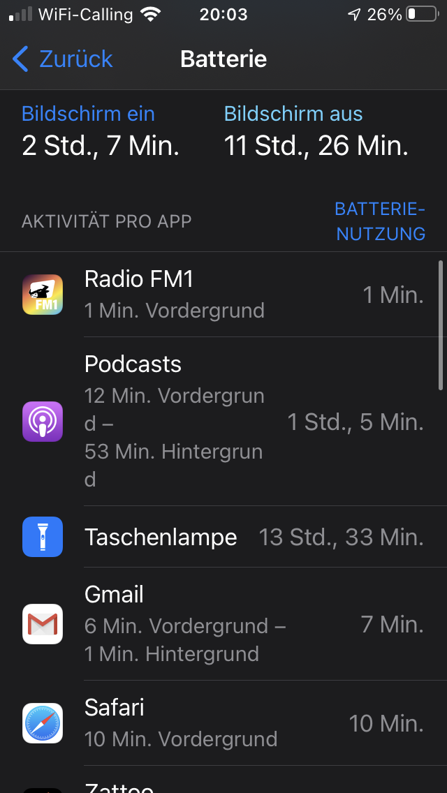 Screenshot (in German) showing the 13 hours usage of flashlight (="Taschenlampe" in German)