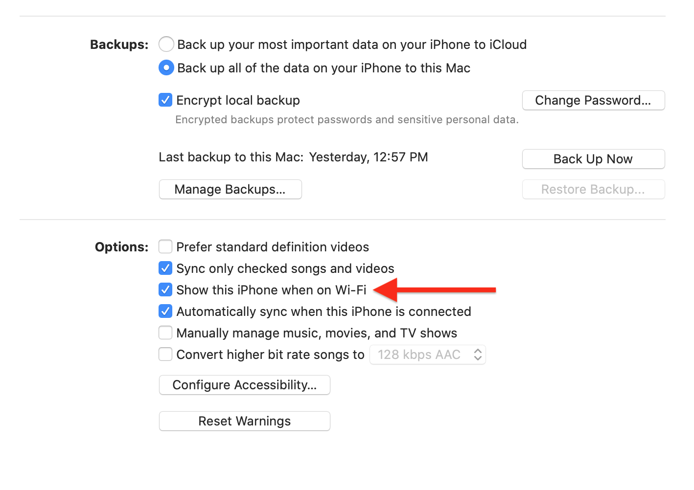 Where is the option to set my iPhone to automatically and wirelessly back up to my Mac using Catalina? I am not seeing it in the normal backup options. I don't run wifi on my Mac but have wifi that connects to the Mac on ethernet. (everything on same network). When I plug the phone in I can manually back up which is convenient for manual backup but what about the auto wireless? Please educate me.