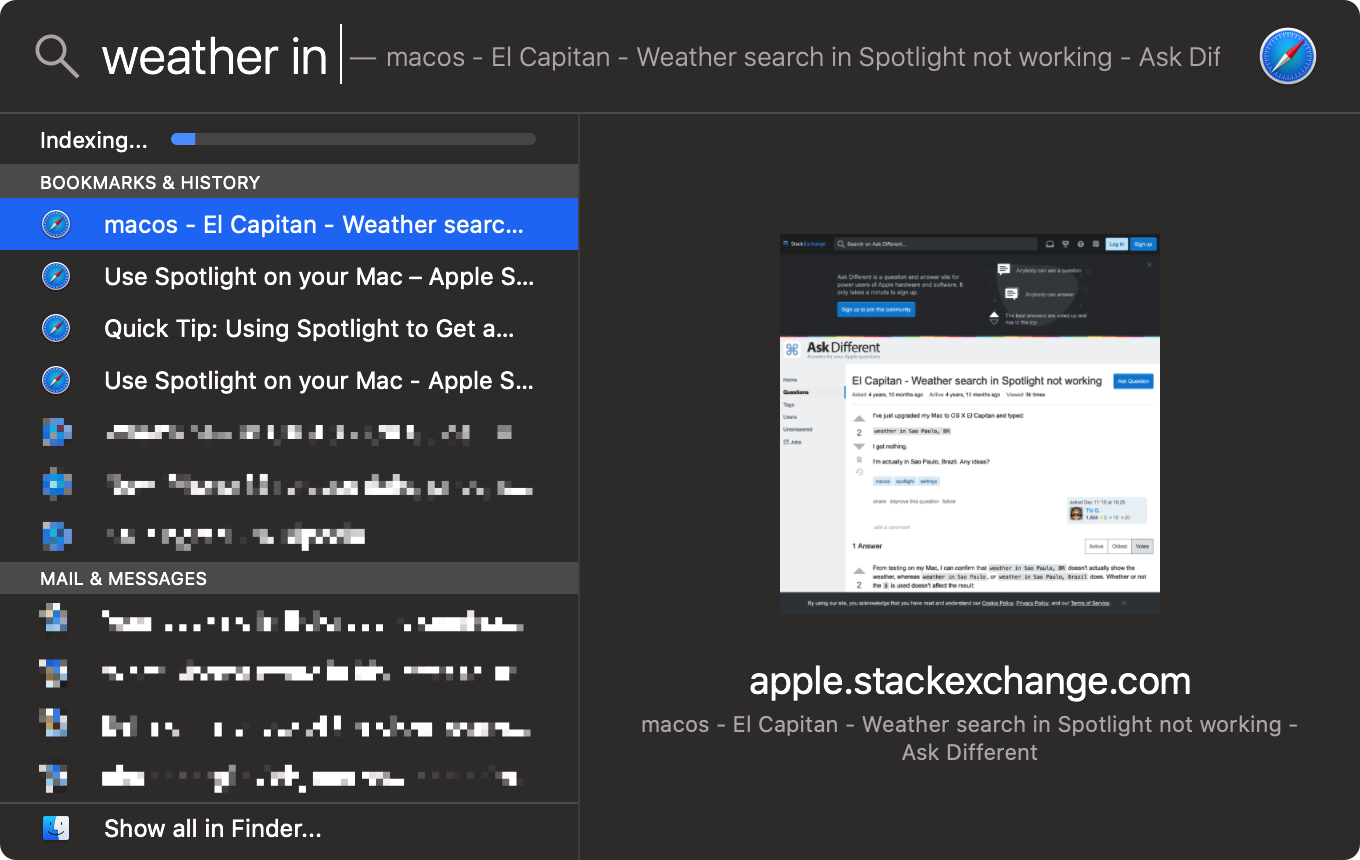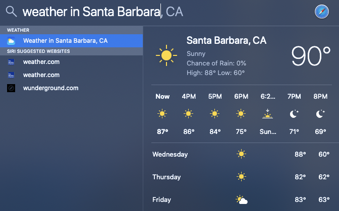 Spotlight finds everything locally but online suggestions don't work. This feature is declared in the Apple Knowledge base: https://support.apple.com/en-gb/HT204014. For example I want to see weather, stock prices right in Spotlight. But when I type weather in the search box Spotlight finds only local files, mail, bookmarks, history. What is wrong with this guy?
