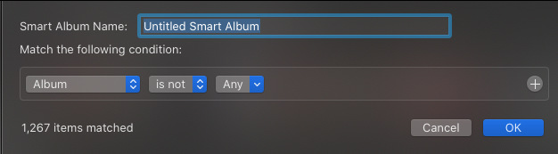 I have over 50,000 photos and tryng to organize them in folders and albums. The prevailing info online says to creat Smart Albums with "photos, is not, any" but "any" is not an option on mine. How do I identify all the random photos that are not in albums? Thanks so much!