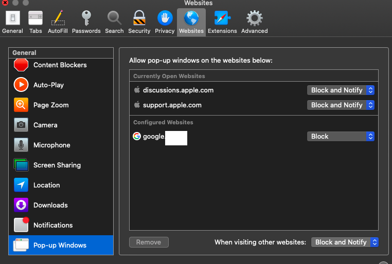 A list of currently open websites will appear. Select the one for that website, and change it to your preference.