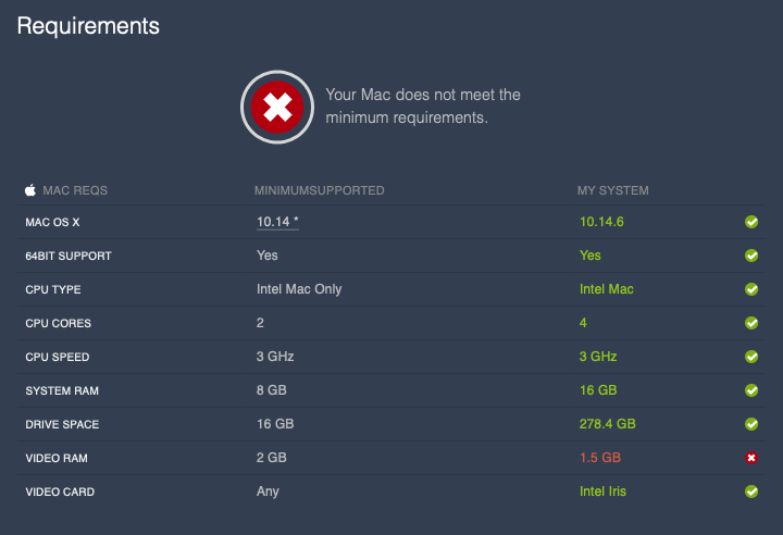 I've been trying to play Tropico 6 on my Mac with no success. My Video RAM is 1.5GB, and the game requires 2GB. I've attached the breakdown of my Mac 2014. Is there anyway to upgrade my Video Ram? I know alot of people on Stream is having this issue as well, so I don't know why Kalypso doesn't release a patch. I spent so much time waiting for the game to load and trying to get it to work, that I didn't qualify for a refund! Maddening!!!!