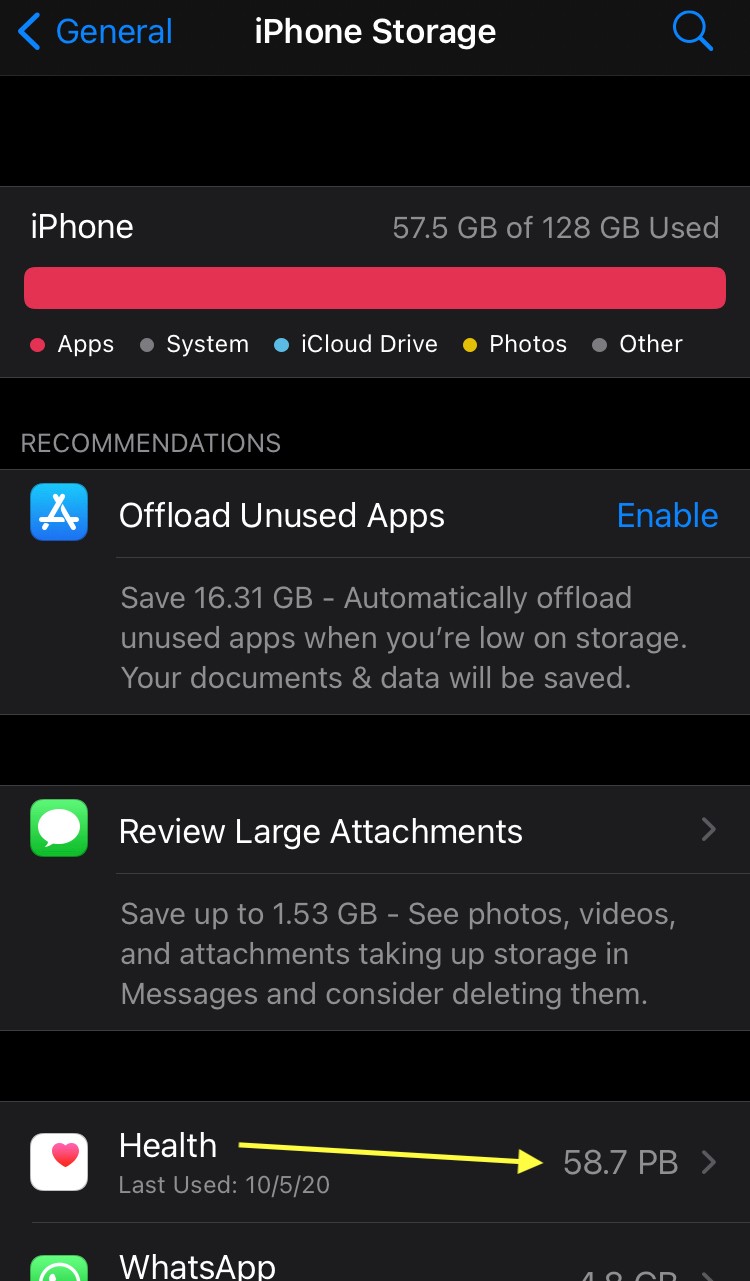 My Health app is 58.7 PB, not possible to backup my iPhone