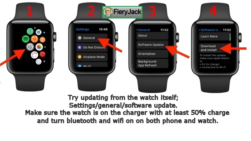 trying to setup a new watch to my phone. I download the watch update as required before it can be setup but it will not install that download. Keeps giving me the same message even though it is plugged in and charged.