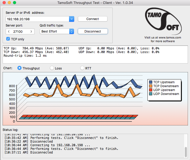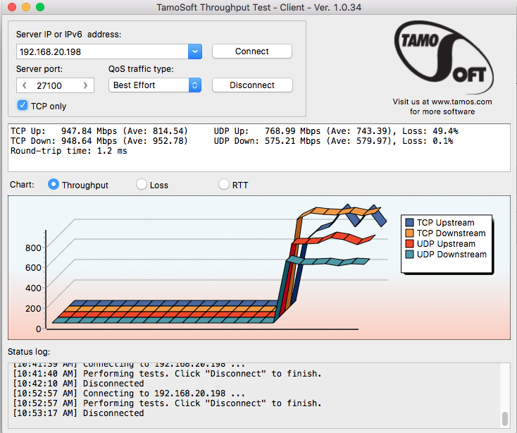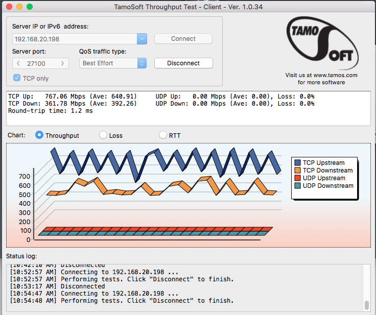 And this is through the airport. The TCP down is in the ballpark Bob referred to .. around 350-380Mbps .. it is a little better on later firmware than earlier testing.. but the upload is a lot better.. as the router is not well balanced between download and upload.