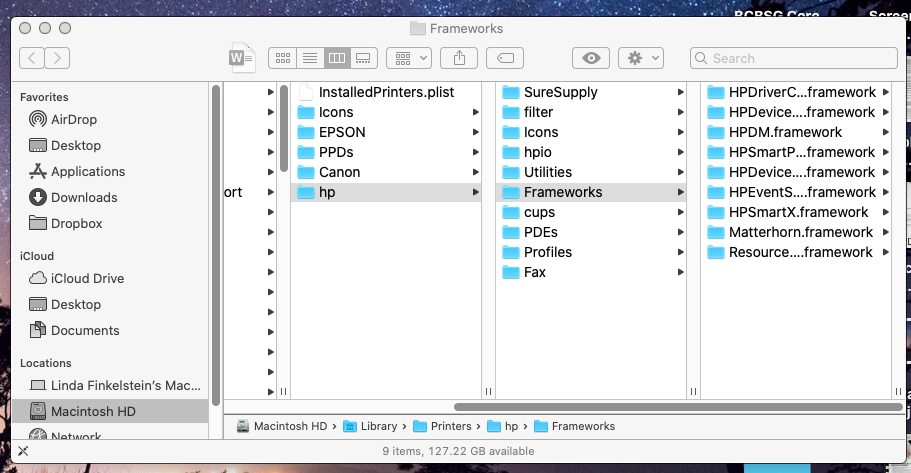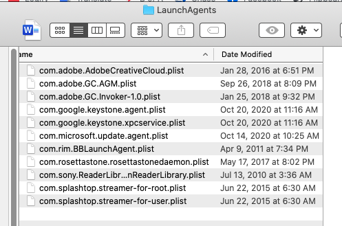 I've been going around on this and have not deleted anything at all yet. I'm a little skittish to delete anything in the LaunchAgent area because I cannot tell what is "new" and what is old and none of the items in my LaunchAgent folder had a mention of "HP" in the files. I have attached that screenshot below the first. The most recent addition was something from Google on 10/20. I was not going to mess with them. The first attached screenshot is what I see when I click on the malware alert box to "open in finder". Does any of this mean anything? Maybe this is where my print drivers are? Also, I have mentioned in this chain that I cannot get the HP Easy Start App to work for some reason on my MAC with Catalina 15.10.7.