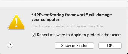 asking if 'hpPostProcessing.bundle' is malware?. There are a whole lot of complaints about other messages popping up and problems with using HP printers which have been posted today. One suggestion points to the fact that 32-bit applications (including Drivers) are no longer supported in Catalina. Another suggests the security certificate was revoked by Apple.
