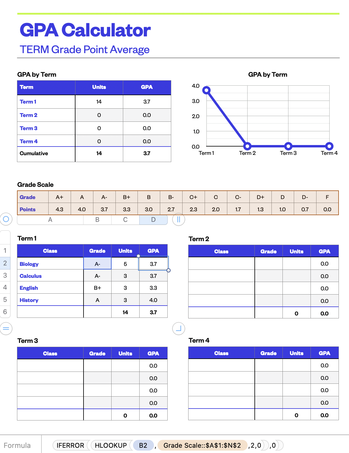 You can then retrieve the number value for column B of your main table using VLOOKUP to find the grade letter and return the number value from the same row of the lookup table.