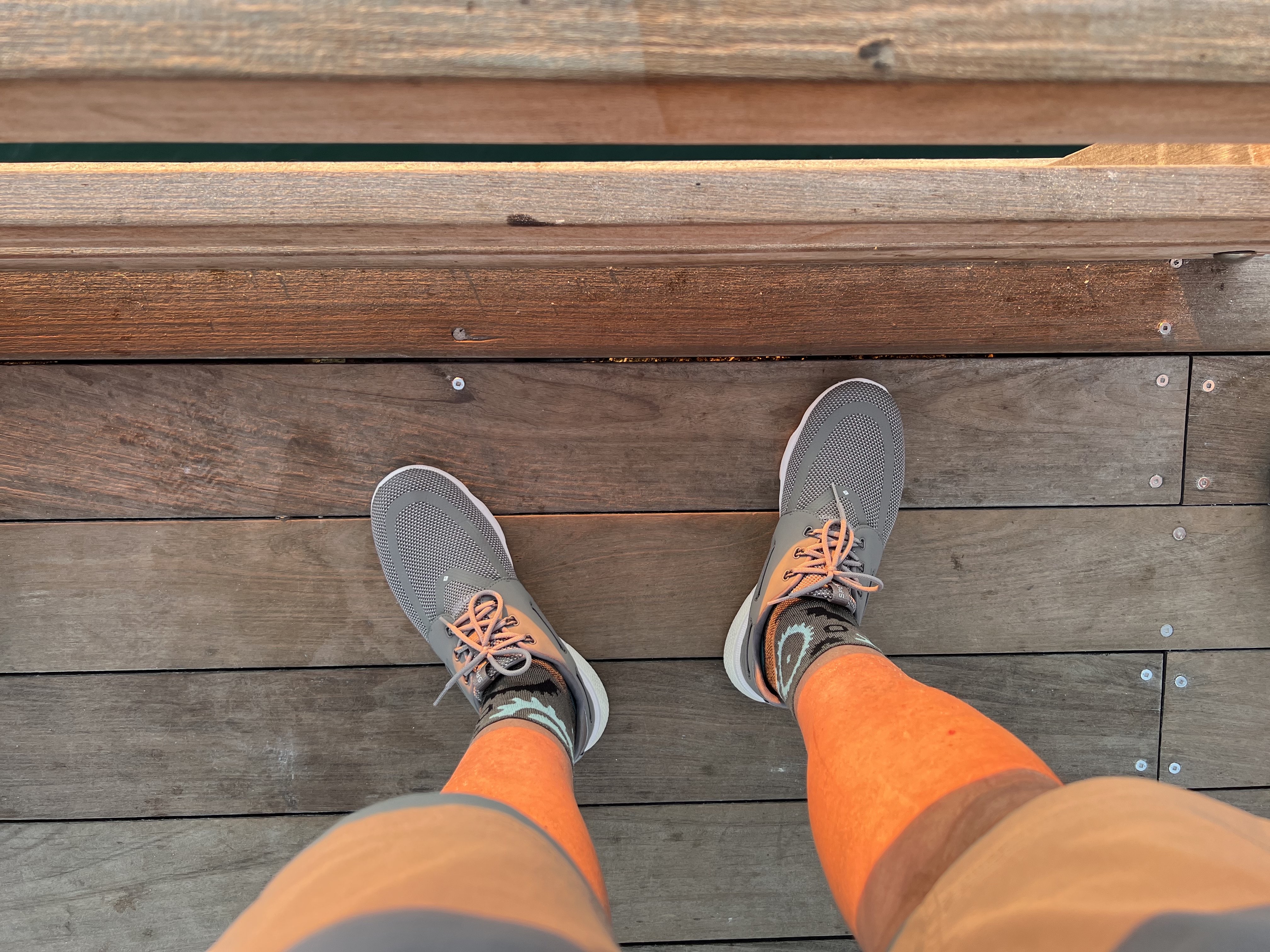 I could post some of the flare pictures but I am not going to get into a tit for tat here. However the one below is difficult to match... I took several pictures of my wife on the Naples pier at sunset and her face, arms, and legs were "glowing orange" - grossly over-processed on the HEIC format so I then took a picture of my legs with the sun hitting them as you can see below. My non-sunset photos were all good, some great particularly at night with the f/1.5 lens, but the iPhone 13 Pro is not very good at sunset unless one is shooting in RAW - that will solve the over-processing but not the flares. And yes, I could use Photoshop or Pixelmator Pro to lower the "temperature" of my legs but editing the shoes and shoe laces would take time... Look where the sun hit them in contrast to where the sun did not. Apple wants "dramatic" colors and that's what they got. Glad I got a 256 GB iPhone, the RAW photos at 25 a pop will fill it.