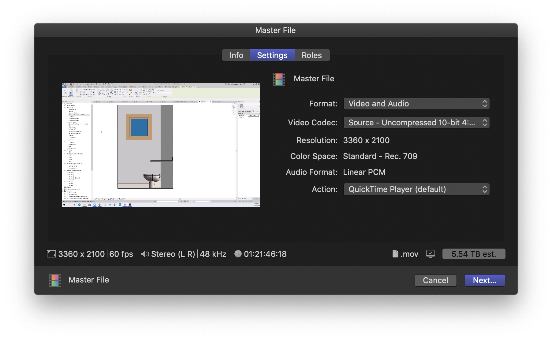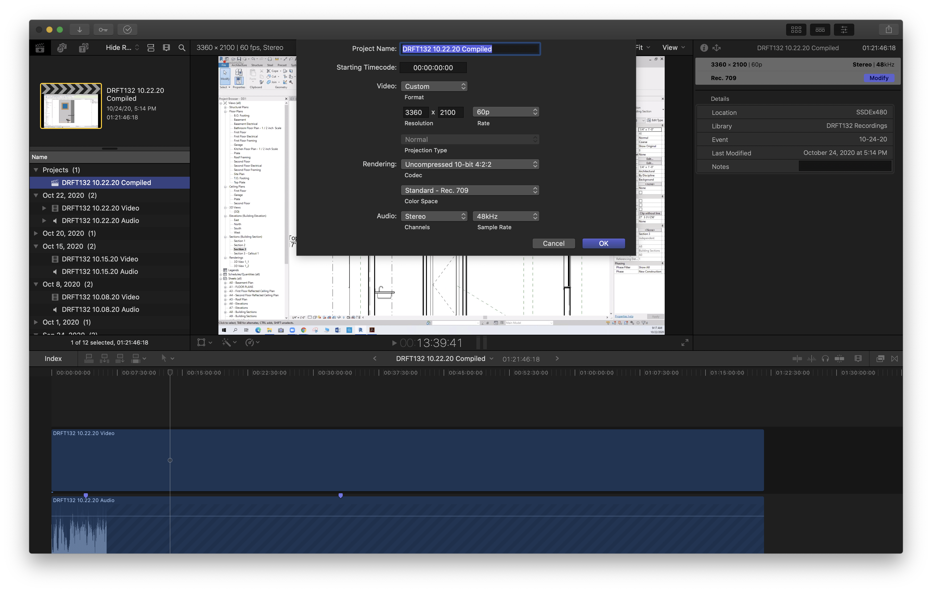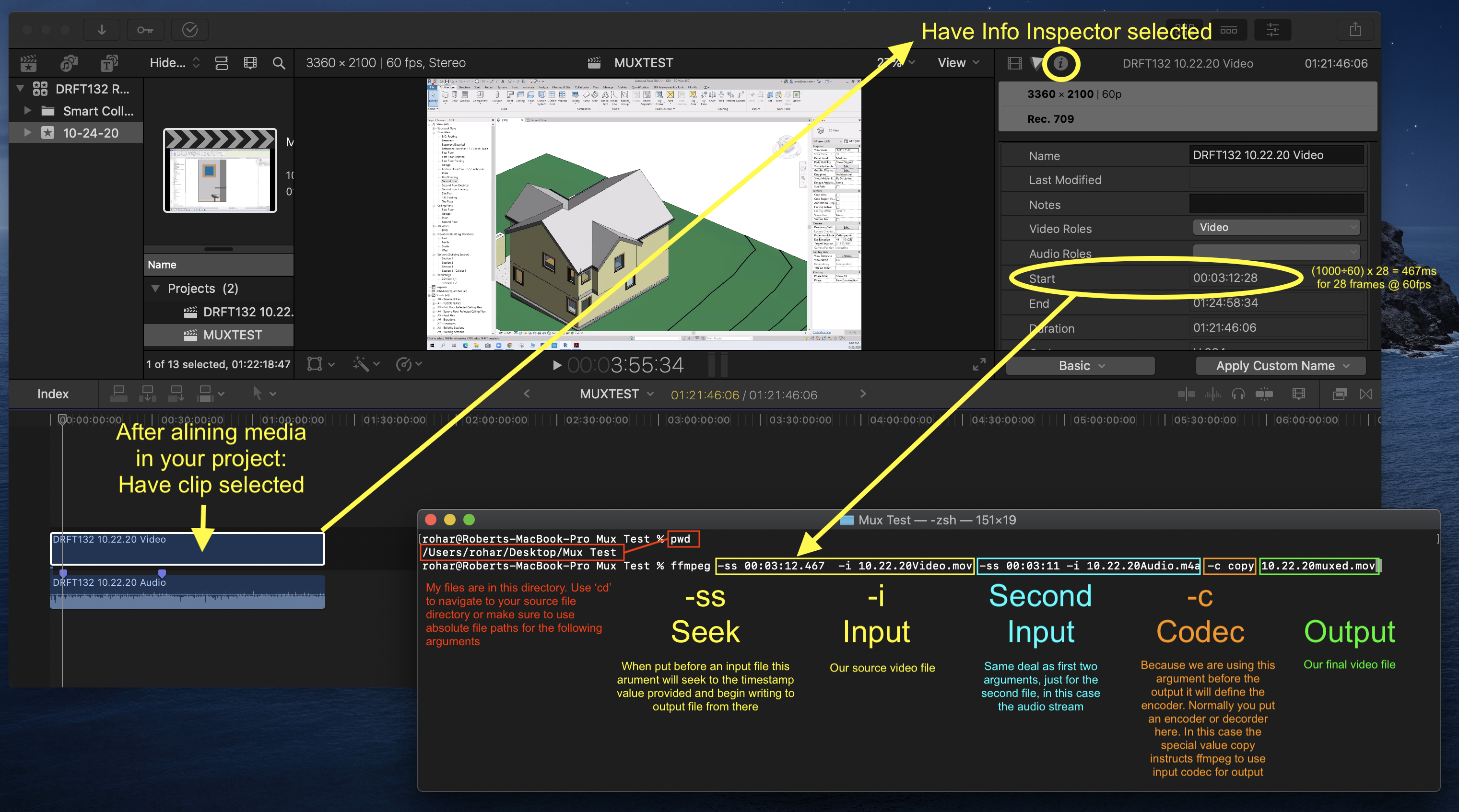 In theory I think I can also use FCPX to find my desired start/end frames for the video and audio files and use ffmpeg to mux the streams without reencoding, but that would probably take me longer to figure out the correct commands. I feel like this is something that should be in theory really easy in a pro video editor with a GUI. Given all the media is being recorded and edited via Apple OS and software is there an approach/setting I'm missing or messing up?