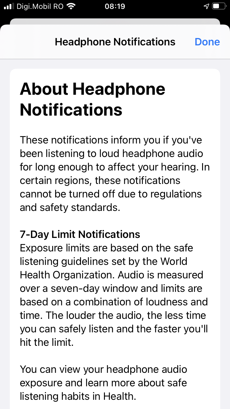 Like 30min in on full volume and then I just get a warning about headphone audio levels, that my music/audio is playing too loud. And immediately the volume turns itself down to a half. Also the notification is just up there until I swipe it back up.