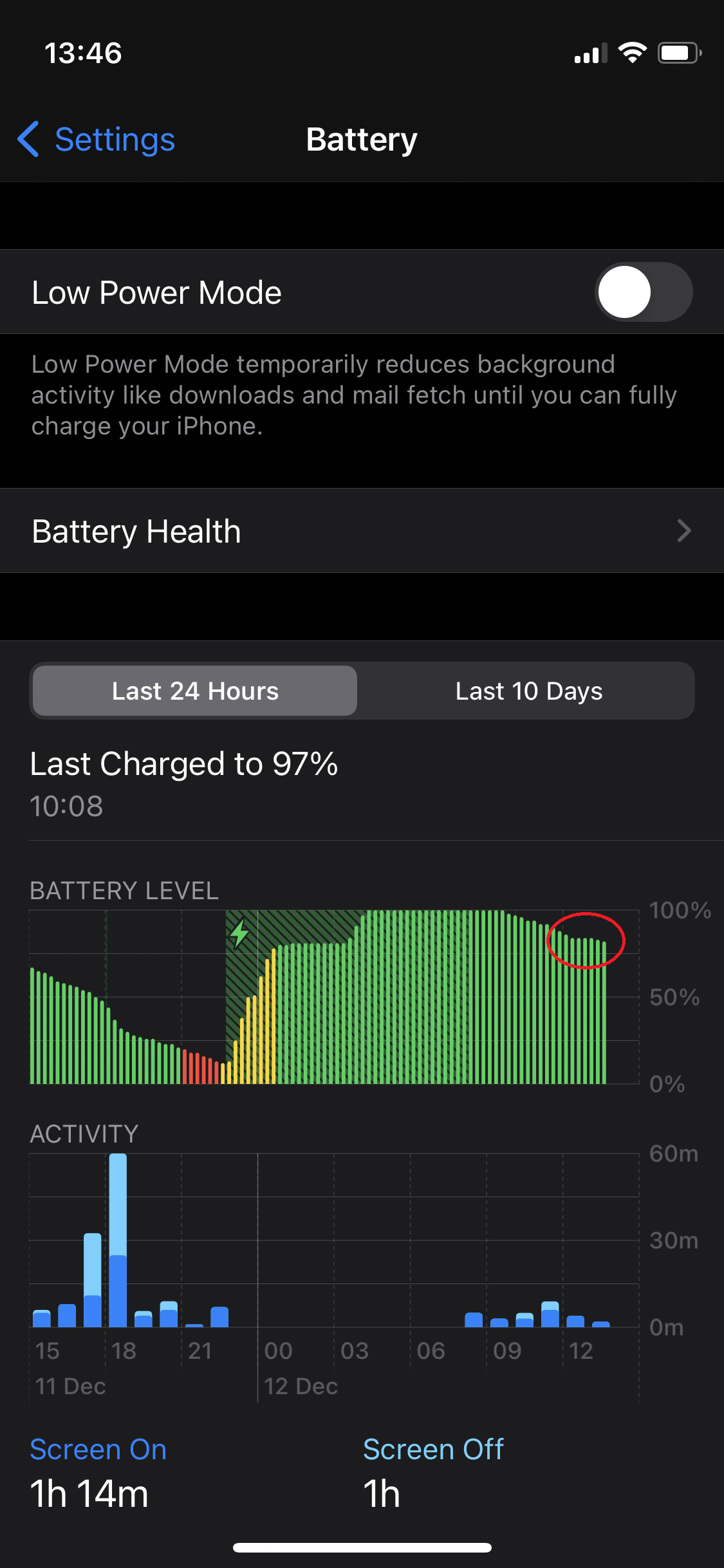 I've enabled dark mode, disabled background app update, disabled 5G and all the other "battery" saving tips out there, but it hasn't helped. The straight line down, with no screen activity is just not normal.