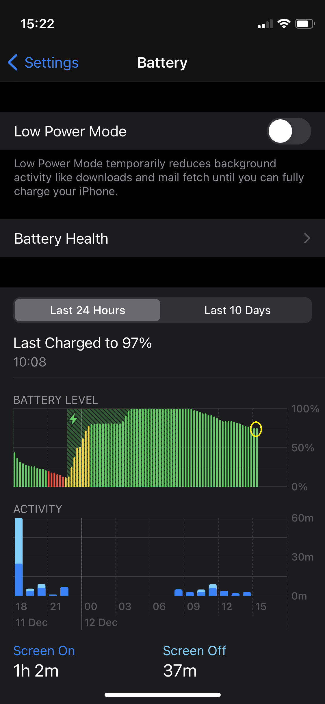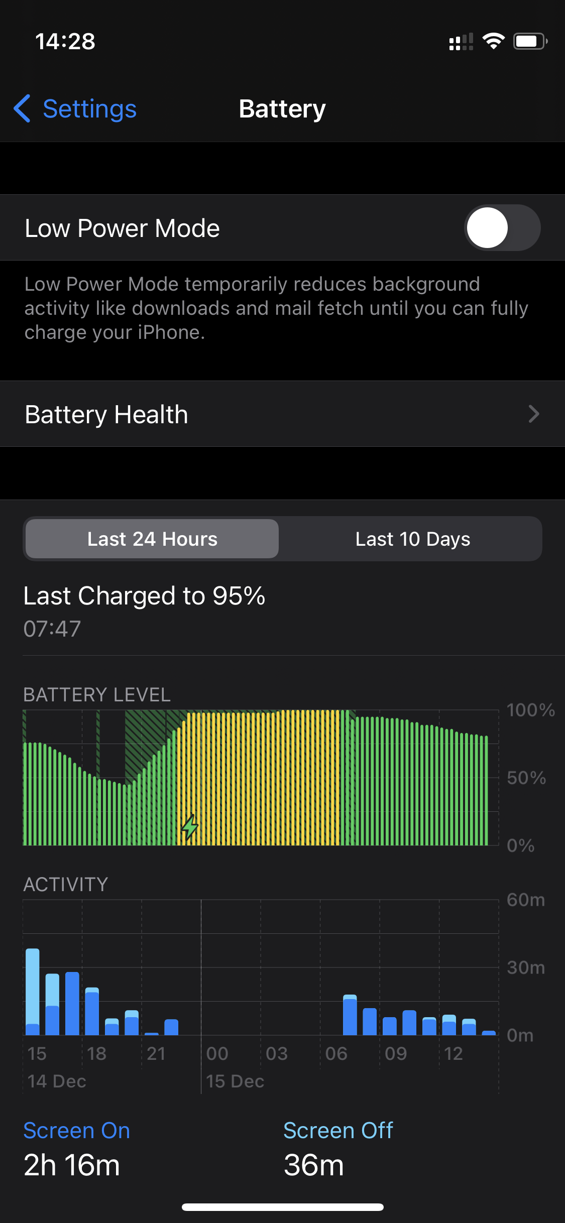 However I'm noticing that the iPhone 12 Pro is draining when idle with almost no background activity at a rate of 4% which is much faster than my previous iPhone 11 Pro, and to be honest a faster idle drain than I can actually remember from a new iPhone. First instinct was to disable Mobile data to see if it was a 5G thing, but I actually don't see any real difference from doing that (which makes sense as I've been on Wifi 98% of the time since I got it).