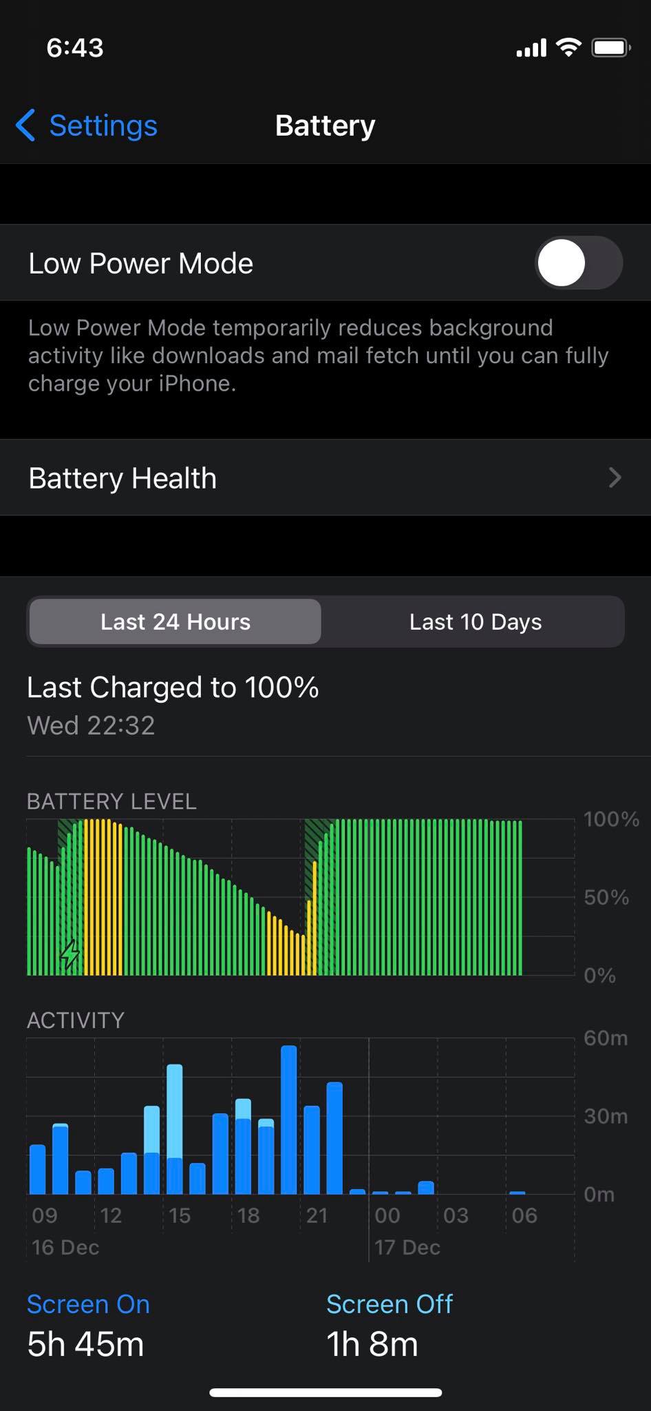 However I'm noticing that the iPhone 12 Pro is draining when idle with almost no background activity at a rate of 4% which is much faster than my previous iPhone 11 Pro, and to be honest a faster idle drain than I can actually remember from a new iPhone. First instinct was to disable Mobile data to see if it was a 5G thing, but I actually don't see any real difference from doing that (which makes sense as I've been on Wifi 98% of the time since I got it).