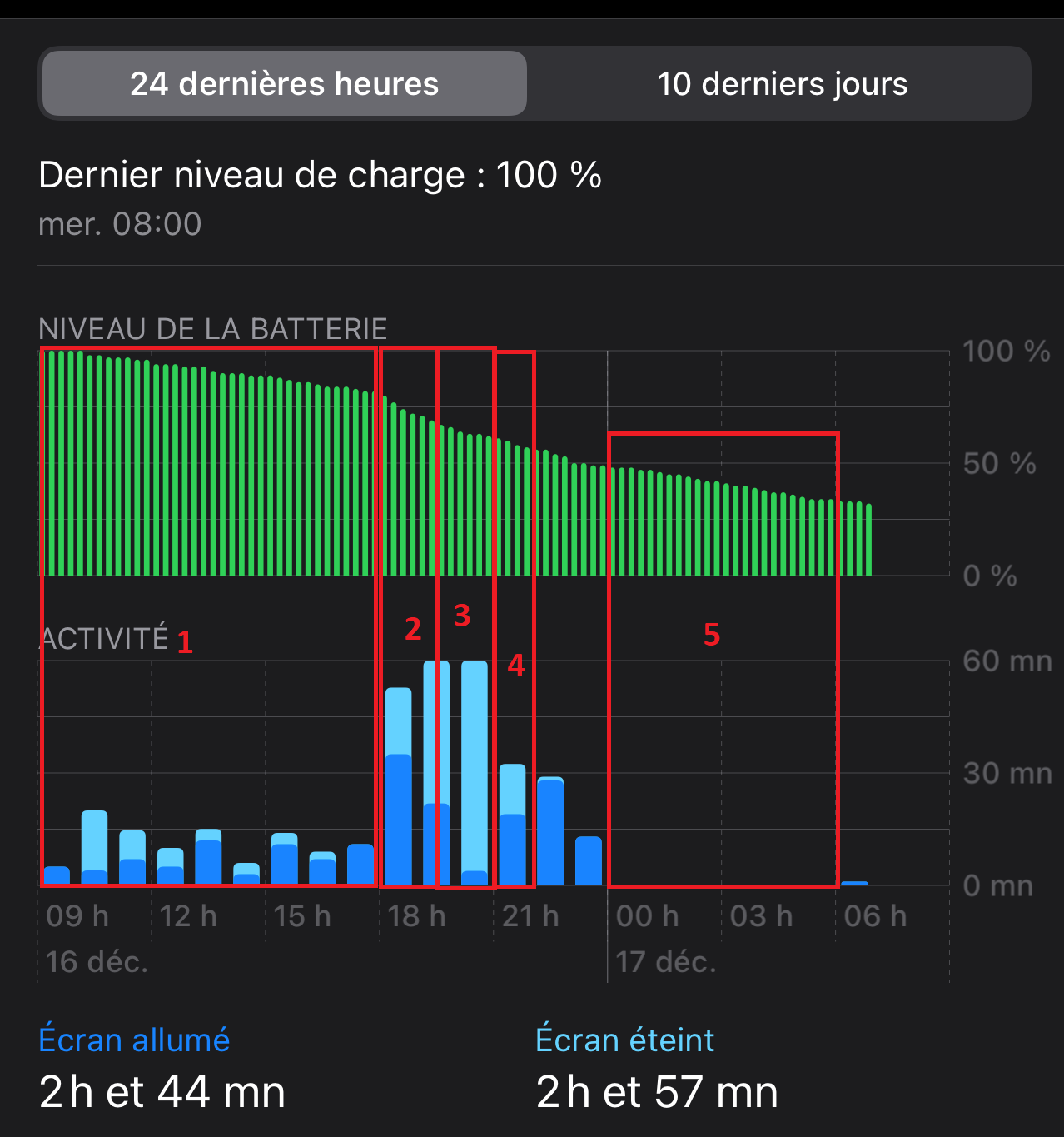 I am using an iPhone 12 Pro Max, linked to a cellular Apple Watch, with dual SIM (both Orange) with data activated in 4G/LTE only on the eSIM. Yesterday, the day after my update to 14.3, my phone seemed to drain less than usual so I got some hope but finally not ... Here are my figures :