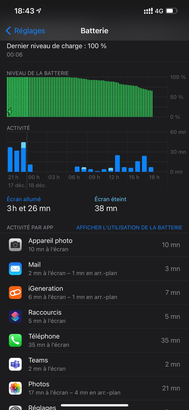 Here is what I get today with an iPhone 12 Pro Max unplugged since 0am last night and with a very low use in the office today : a few texts, a 15 min phone call, 15 photos, some messages on Microsoft Teams and of course the usual background activities and mail refresh.