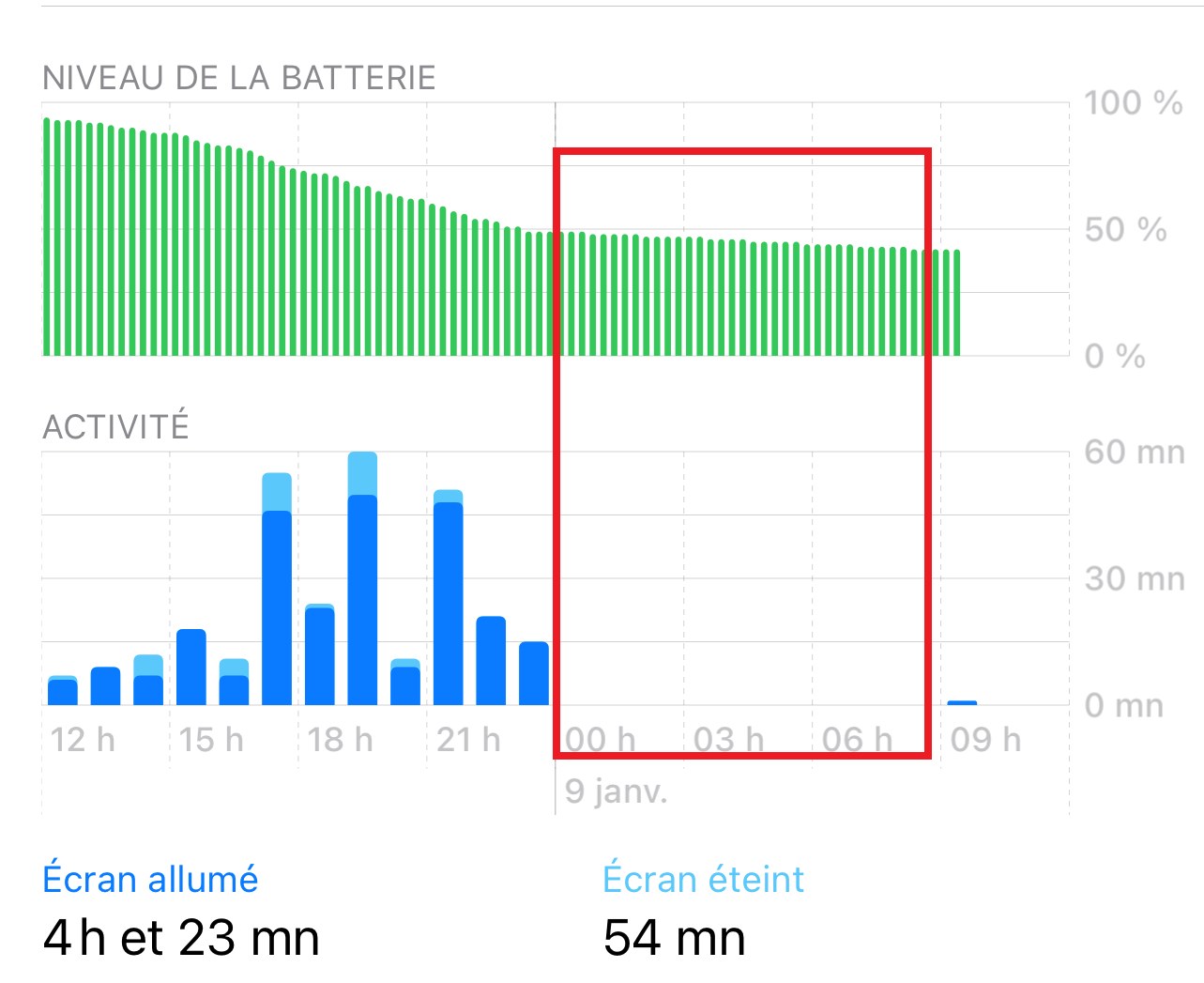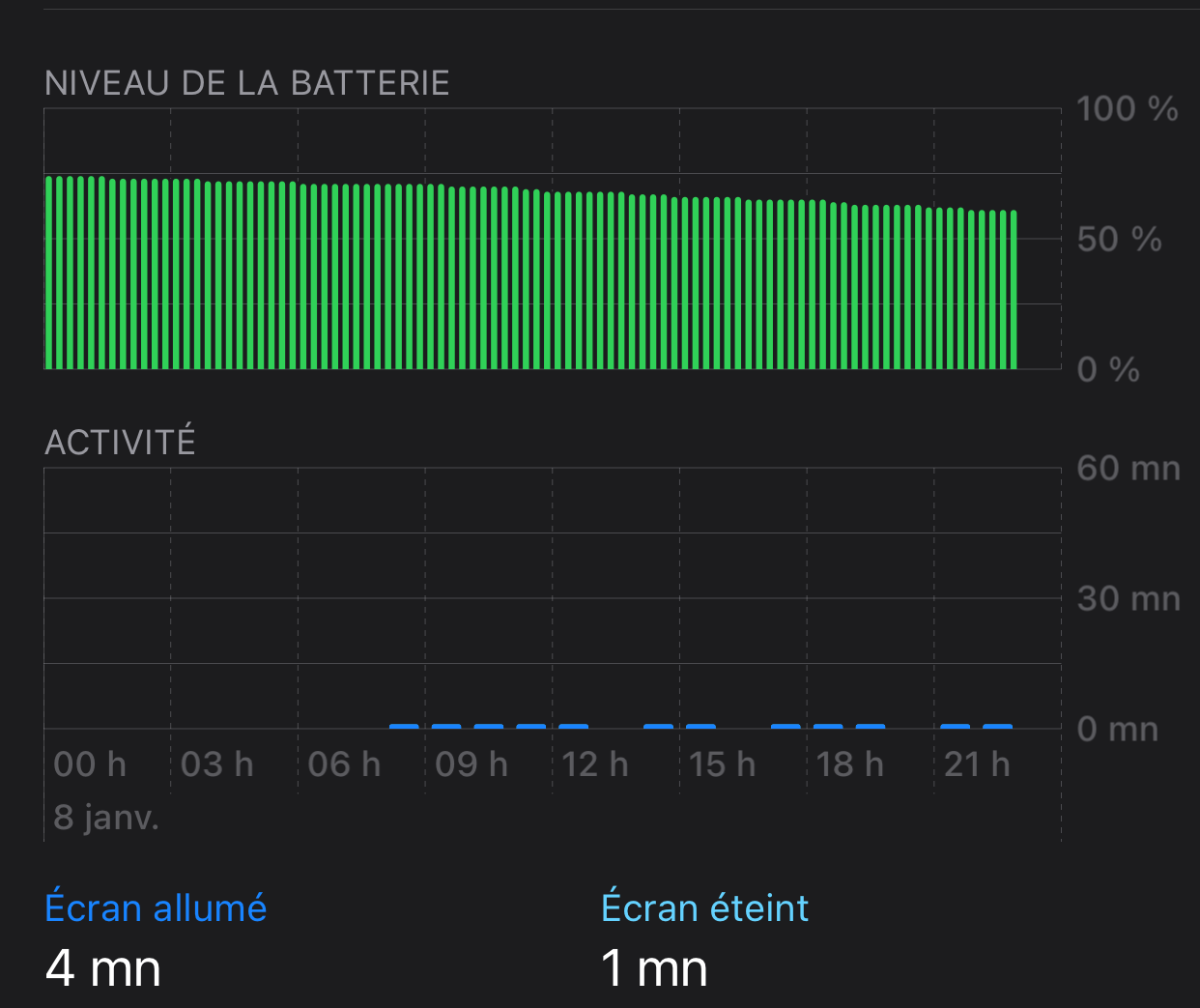 Here is how the 11 Pro Max with same setting BUT no SIM behaves in idle, we can see that after having fallen from 100%, there is a regular and constant battery use.