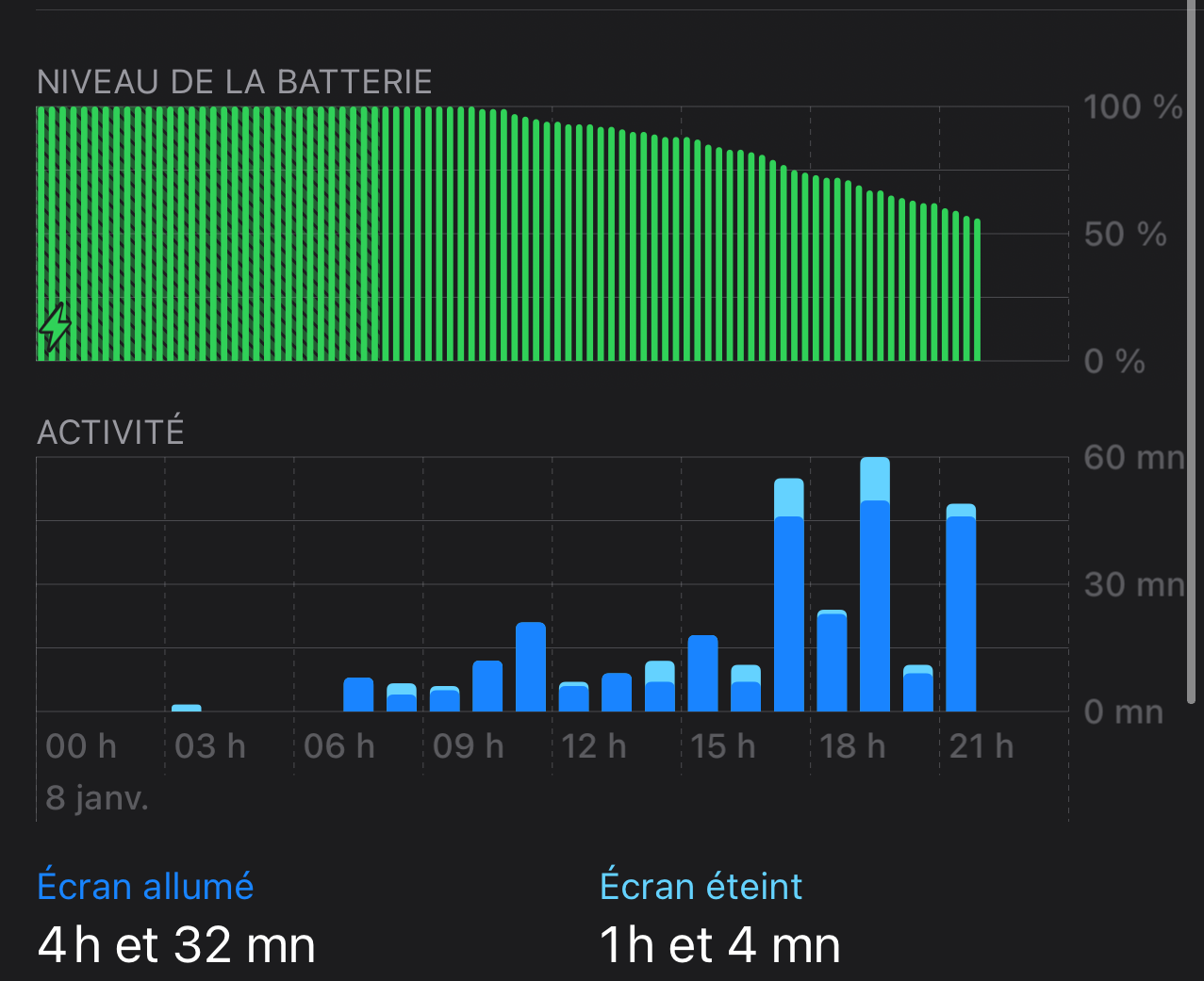 Then I switch back to my 11 Pro Max which of course worked better. After one week, I went back to 12 Pro Max (each time from a finder back up) and now I get this which is more close to an "allowable" behavior knowing that the battery is smaller on 12 than on 11. Please not that I haven't adapt the settings, I don't turn anything off in comparison to my previous settings and I have 2 SIMs :