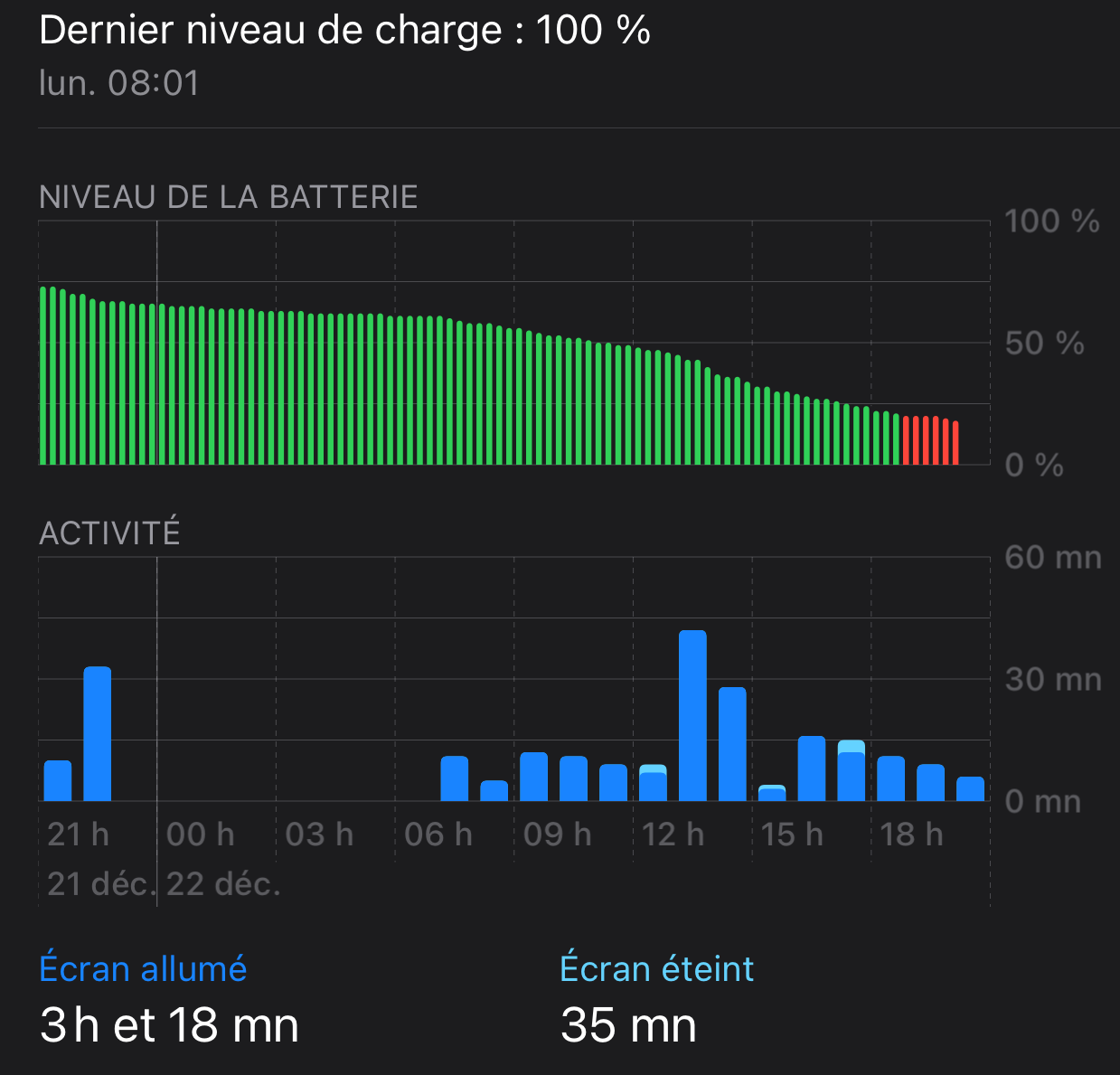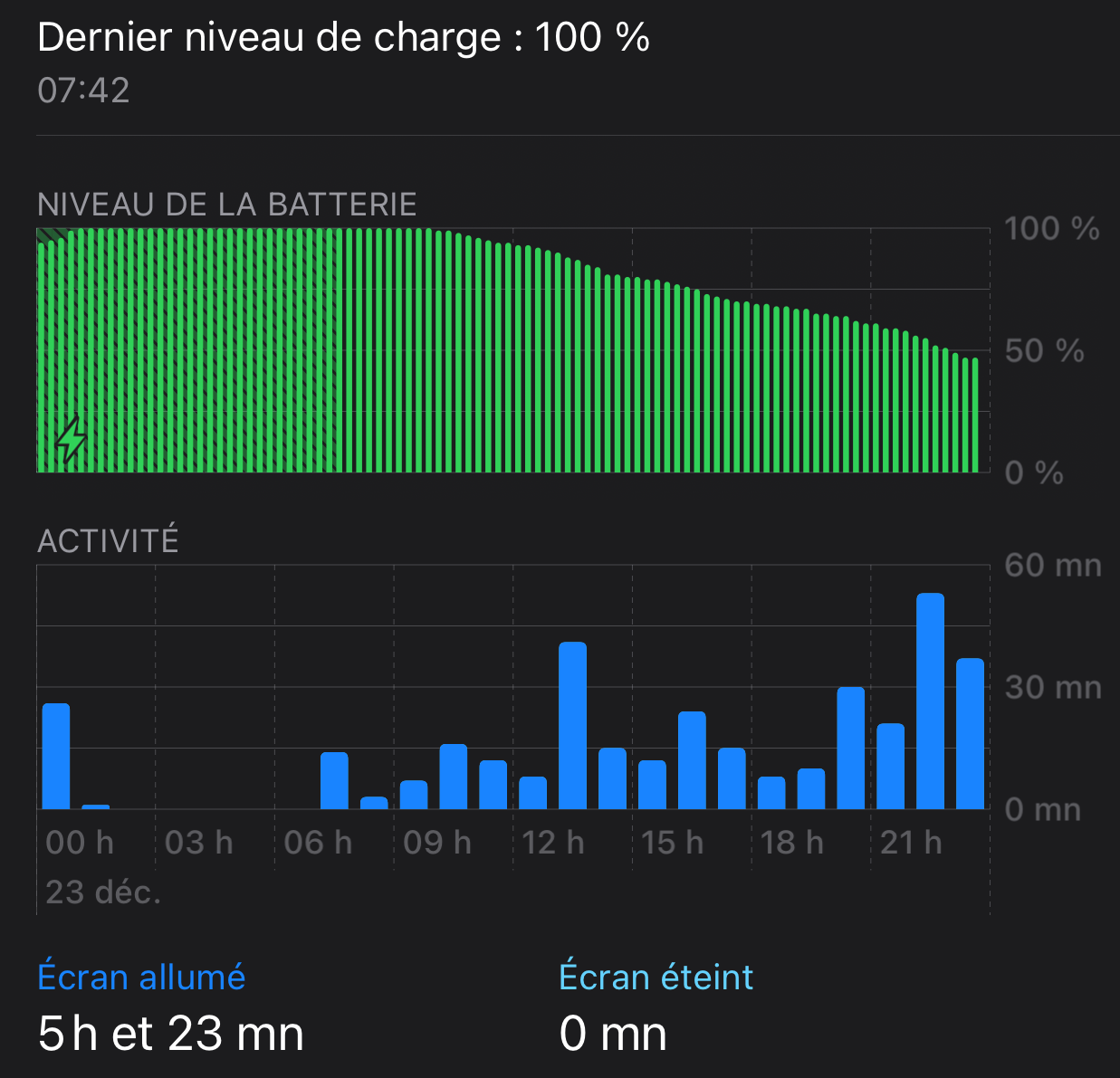 So I went back to the iPhone 12 Pro Max on Saturday via the same protocol and let it plugged in all night to Sunday and as most as possible during Sunday in order to allow him to complete the indexation process. Once it was done for the picture, I unplugged it at 6:30pm yesterday, used it a little and went to sleep at 11:30pm with 94%. I wake-up this morning with 89%.