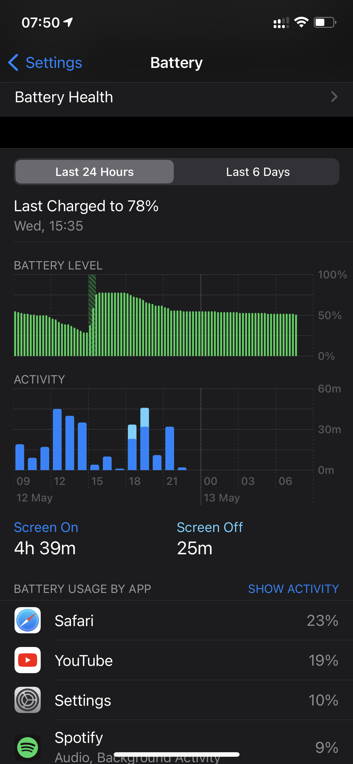 However I'm noticing that the iPhone 12 Pro is draining when idle with almost no background activity at a rate of 4% which is much faster than my previous iPhone 11 Pro, and to be honest a faster idle drain than I can actually remember from a new iPhone. First instinct was to disable Mobile data to see if it was a 5G thing, but I actually don't see any real difference from doing that (which makes sense as I've been on Wifi 98% of the time since I got it).