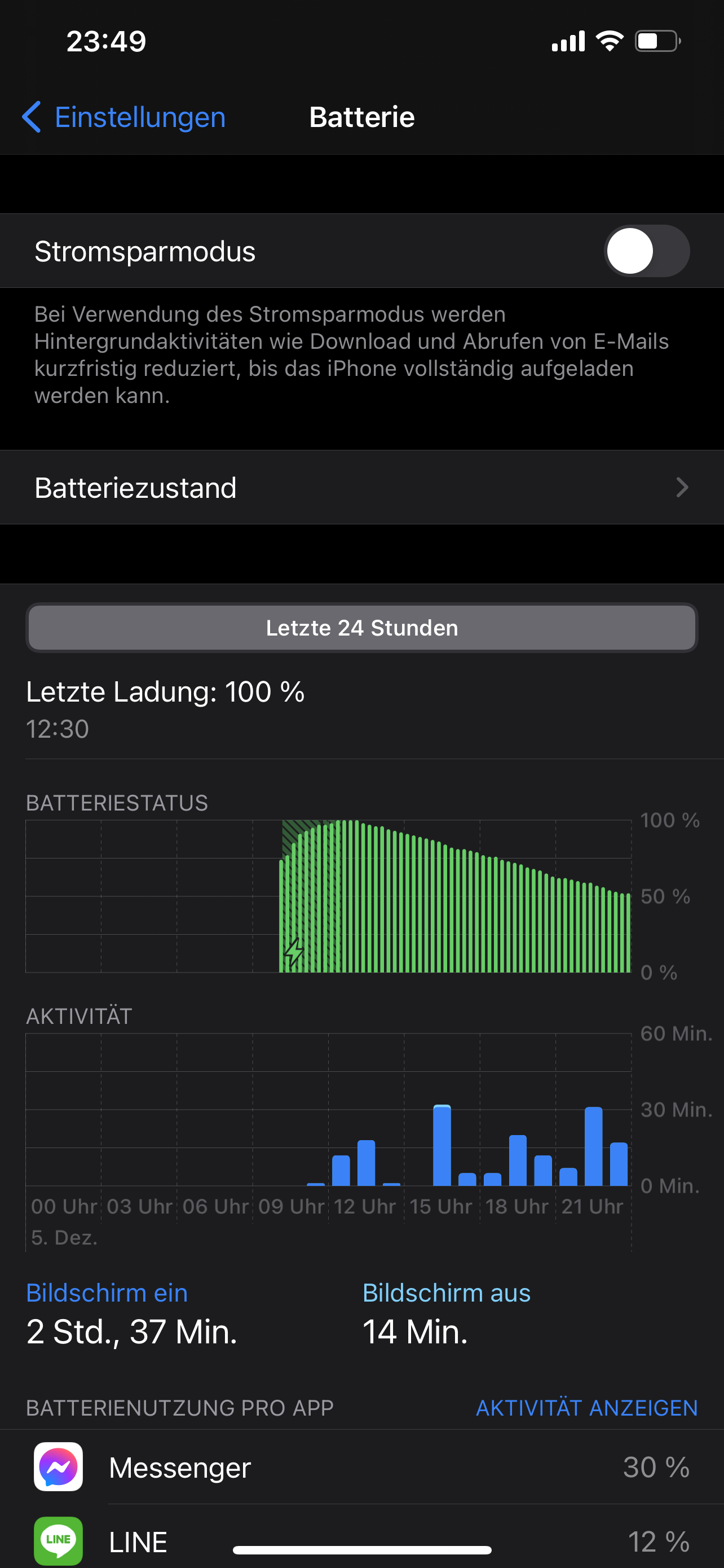 This battery life (12 Pro Max) is absolutely disgusting. Last charged to 100% 24 hours ago (09:06 yesterday...it’s now 09:04 today). Total of just under 2 hours screen on time in last 24 hours. Battery is down to 58%. On the PRO MAX! The old 11 Pro Max, which is advertised as having the same battery life as the 12 Pro Max, would have over 80% left with the same usage! Needless to say...it’s setup exactly the same as the 11 Pro Max! And on WiFi with 4G (not even 5G). Vodafone UK Single physical SIM.