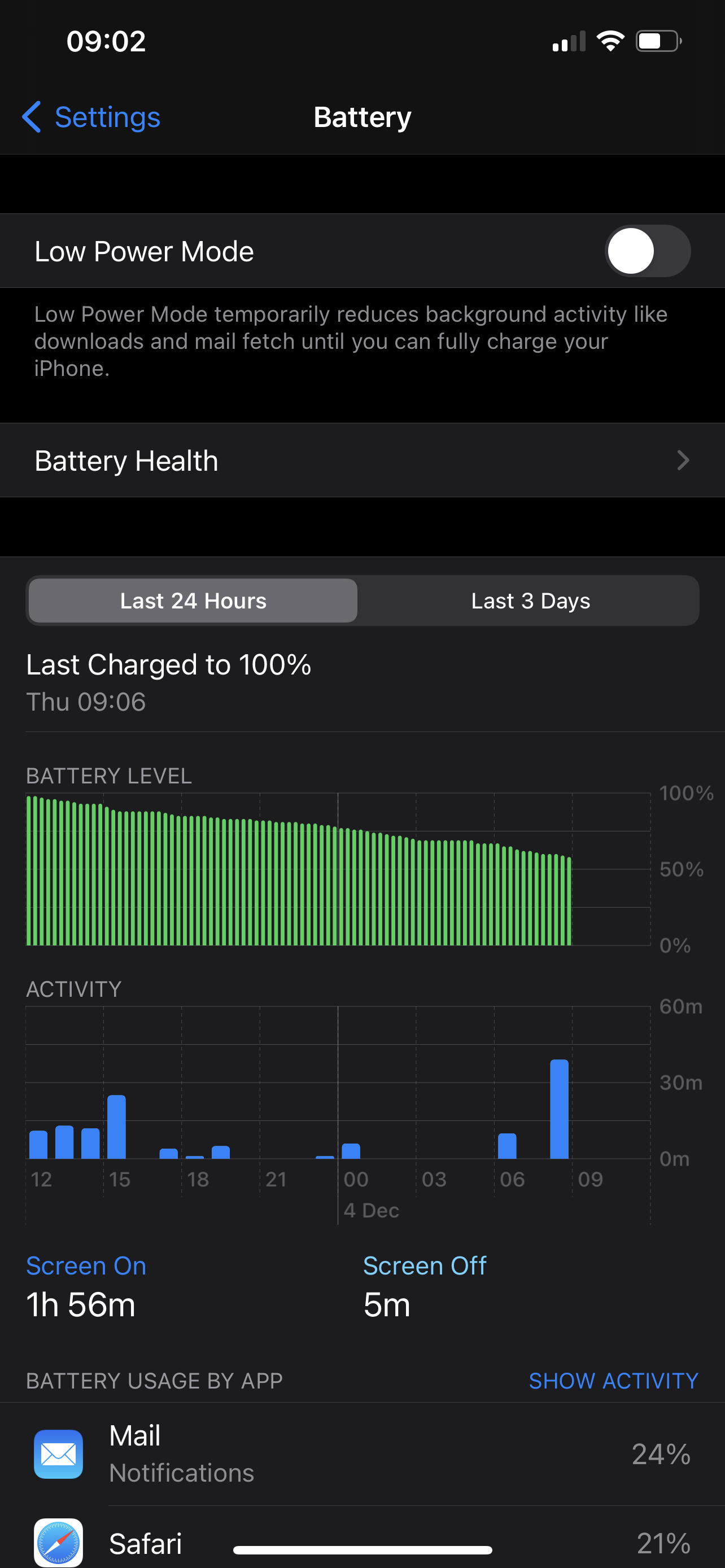 However I'm noticing that the iPhone 12 Pro is draining when idle with almost no background activity at a rate of 4% which is much faster than my previous iPhone 11 Pro, and to be honest a faster idle drain than I can actually remember from a new iPhone. First instinct was to disable Mobile data to see if it was a 5G thing, but I actually don't see any real difference from doing that (which makes sense as I've been on Wifi 98% of the time since I got it).
