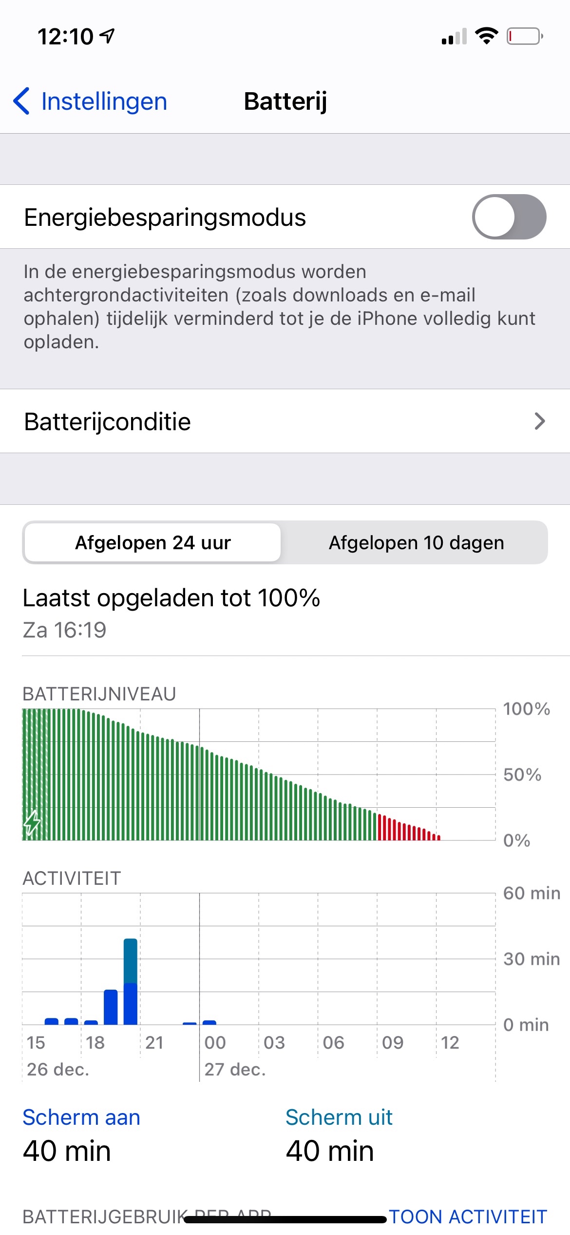 Yesterday morning at 10.00I took my iPhone 12 from the charger at 100%. Just checked my e-mail twice, the rest of the day It was in my pocket unused. I forgot to take it out and charge, and this morning it was at 12%!!