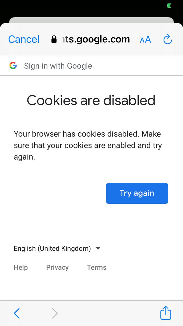 Me too I have not been able to sing in to my google account(s) since about December since at leas iOS 14.1 When I go to sign in to my apps with google it says cookies are disabled o bathos device when they are enabled. I have been using Sign In with Apple since it came out but for some of the apps that I use I need to sign in with google and can’t do that I am beyond annoyed and need this fixed so I can use apps that I need for important stuff.