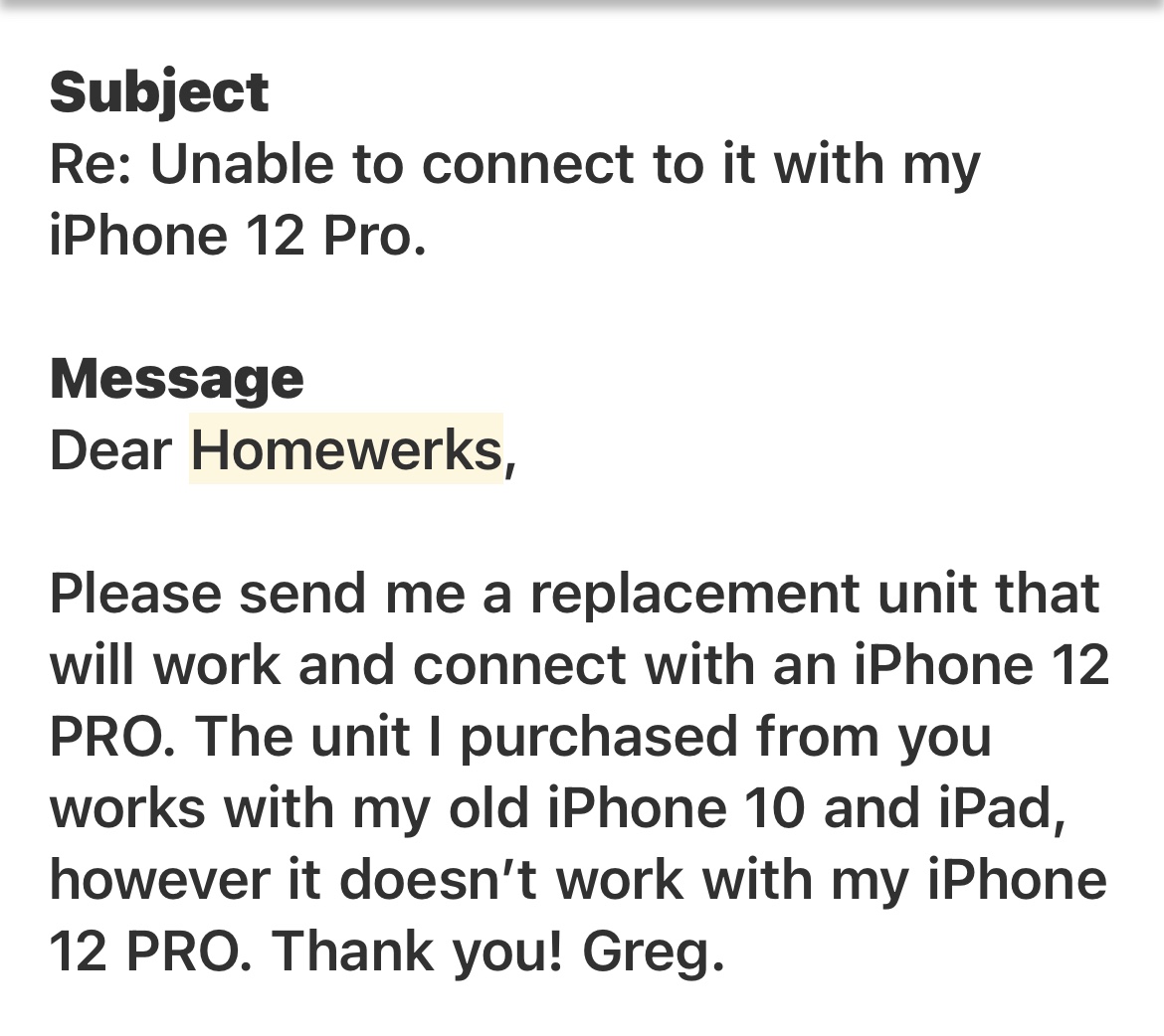 I called them and the blame was placed on Apple. They said if I were to purchase a new Homewerks that it would not be the problem. Yeah right.