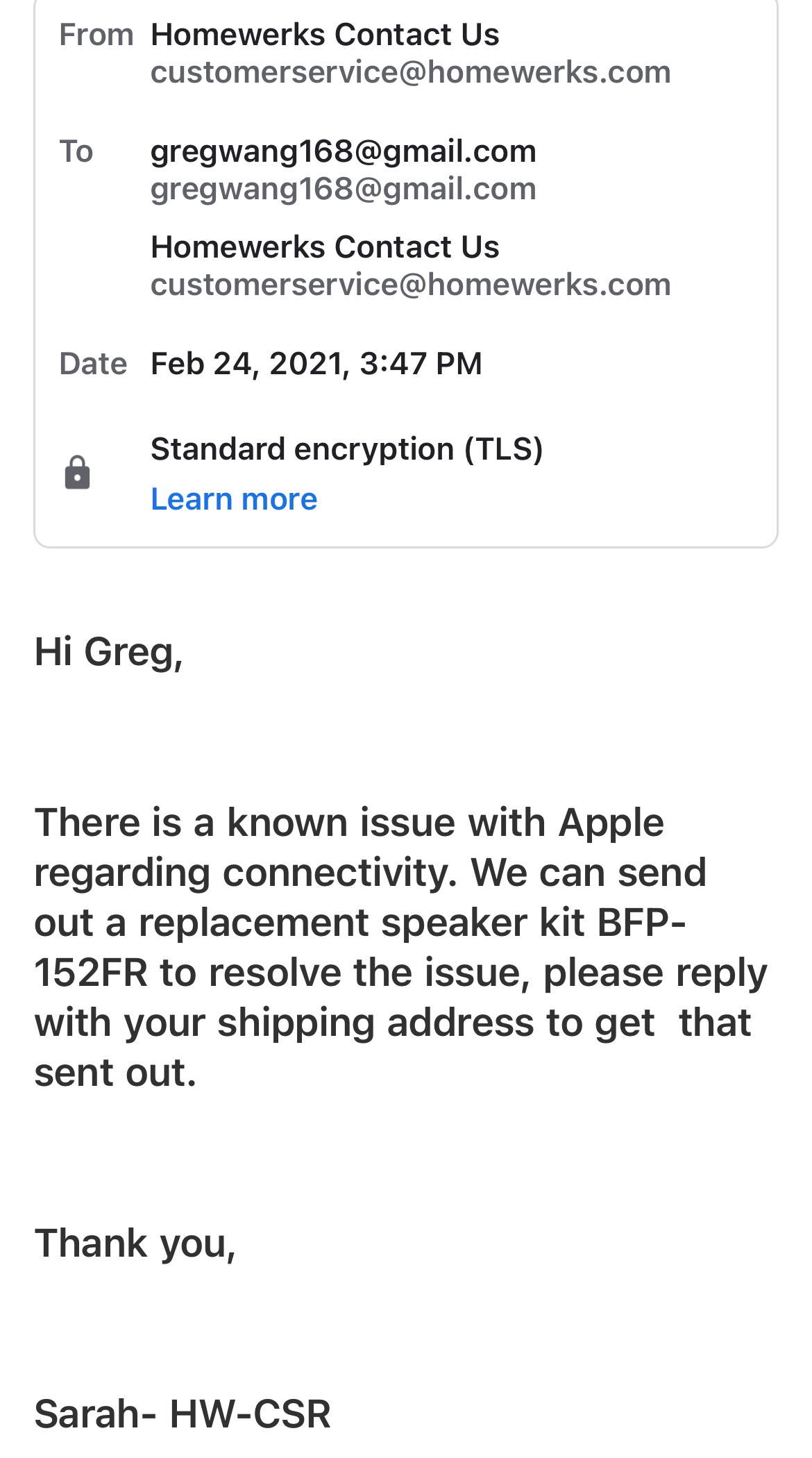 See pictures attached of the email I sent to Homewerks and their immediate reply to me to let me know this is a known issue, and that they will sent replacement speakers to me which they did.