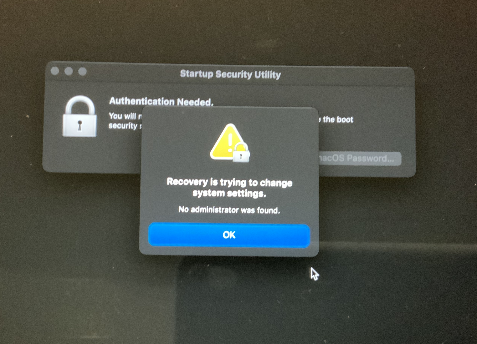 As soon as I reboot into Recovery Mode, it asks me for iCloud account, then makes me create a new password and after that it says: