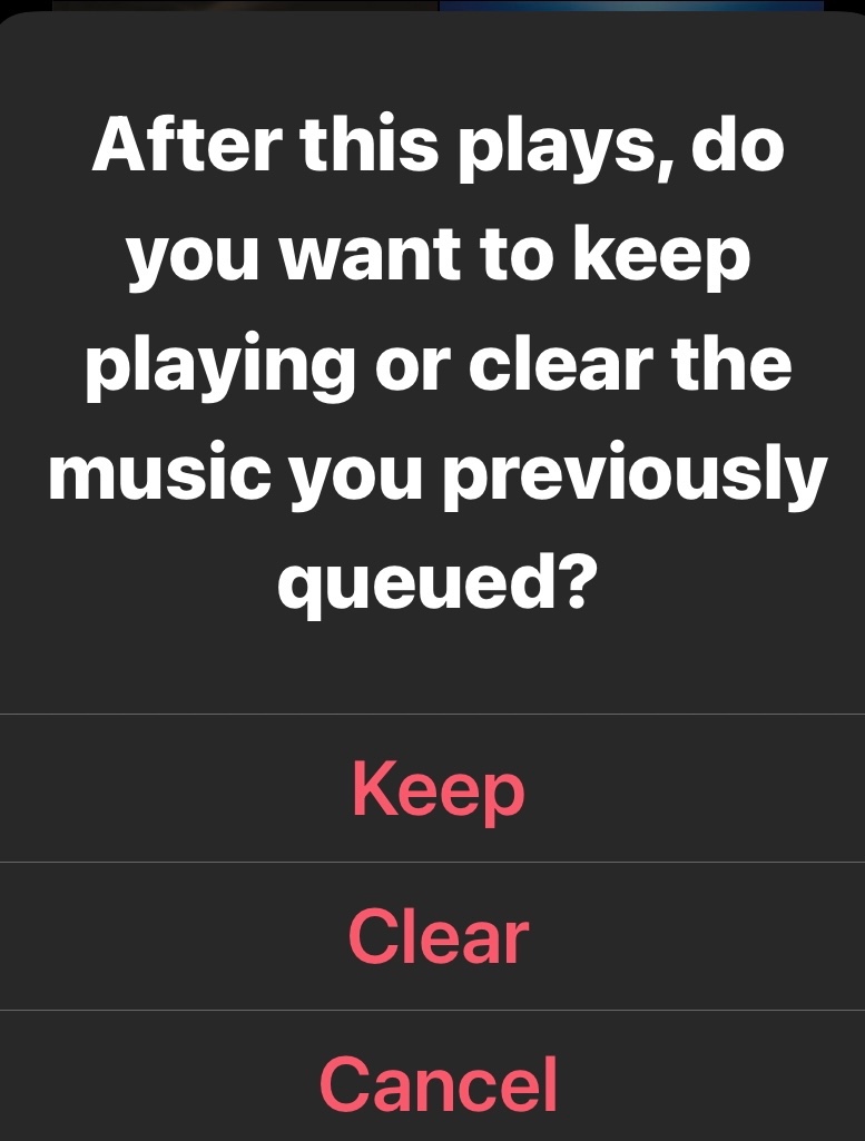 "after this plays do you want to keep playing or clear the music you previously queued?"