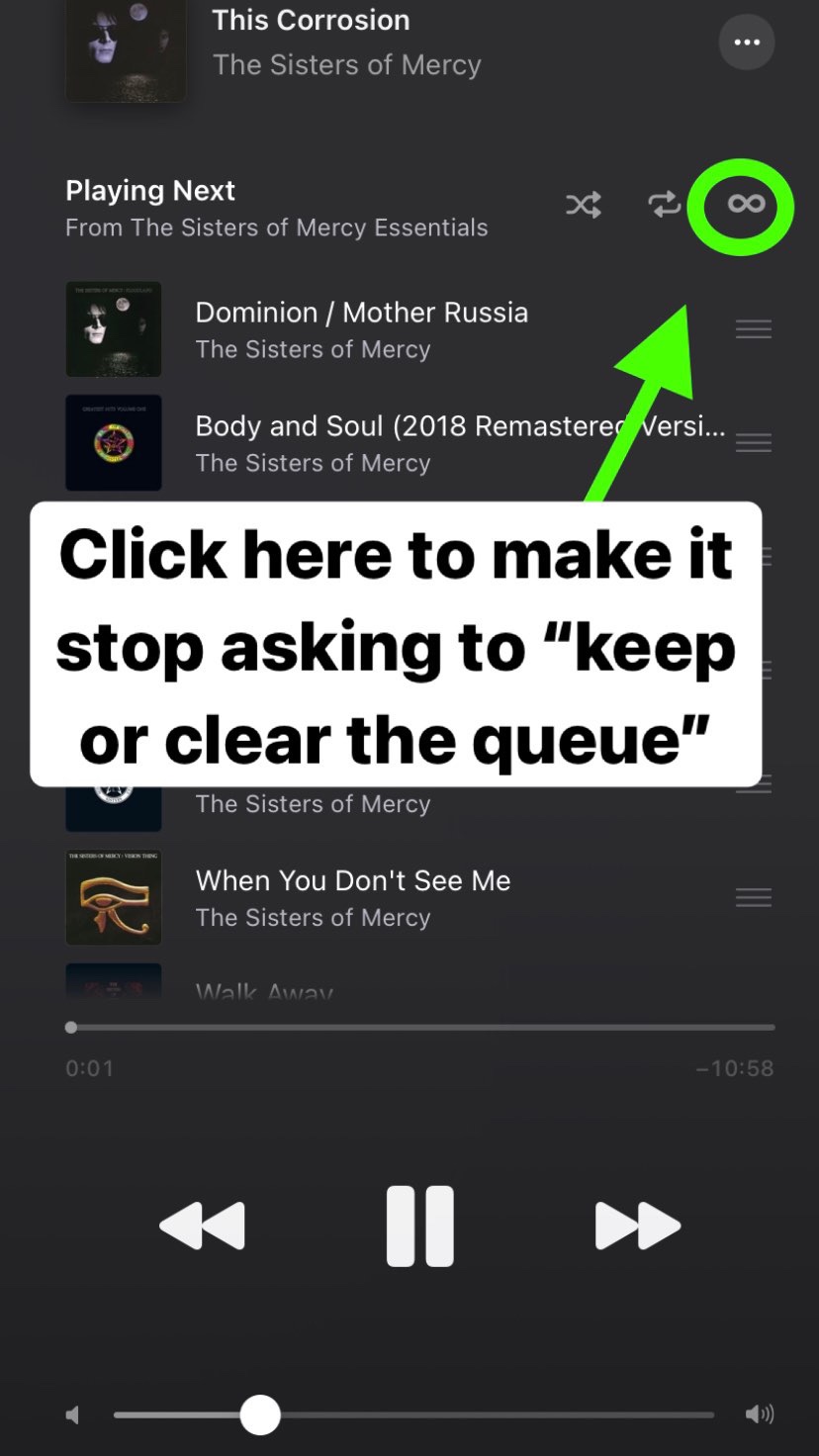 "after this plays do you want to keep playing or clear the music you previously queued?"