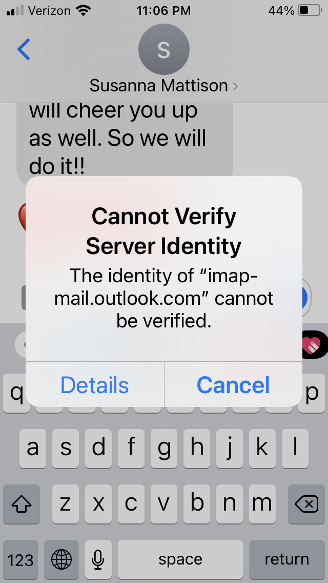 I’m getting constant popups that say Cannot verify server identity. The identity of imap-mail outlook.com cannot be identified. I have tried rebooting my phone . I also deleted my yahoo and hotmail snd iCloud Accts and then added them again. Nothing has worked. Can anyone help me solve this issue? I’m unable to use my phone because it pops up so frequently. Thanks so much! I have the iPhone SE.